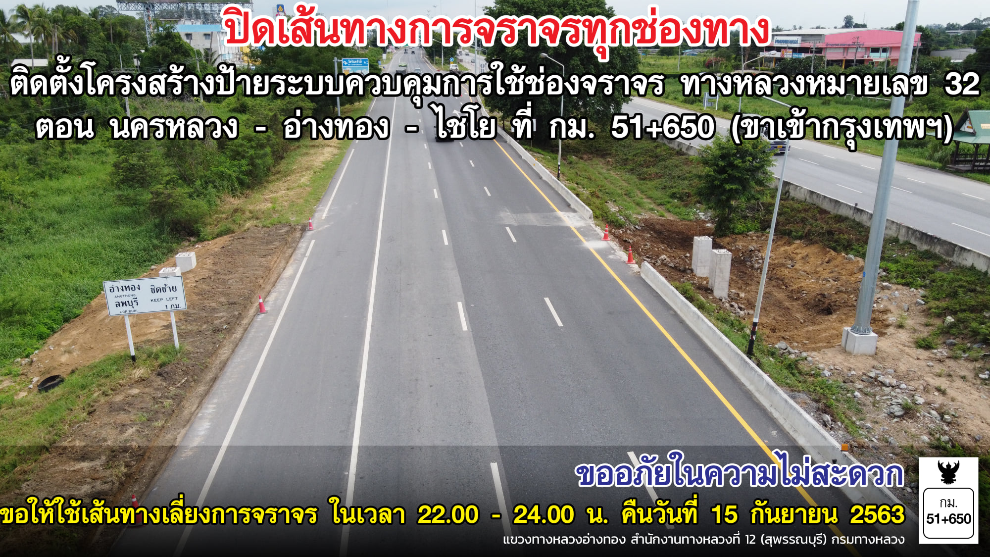 สำนักก่อสร้างสะพานจะทำการปิดเบี่ยงจราจรถนนพหลโยธินฝั่งขาออกไปสระบุรีที่ กม.56+200 พื้นที่ ต.ลำไทร อ.วังน้อย จ.พระนครศรีอยุธยา ในวันที่ 21 กันยายน 2563 เวลา 22.00 น. – 04.00 น. ของวันที่ 22 กันยายน 2563