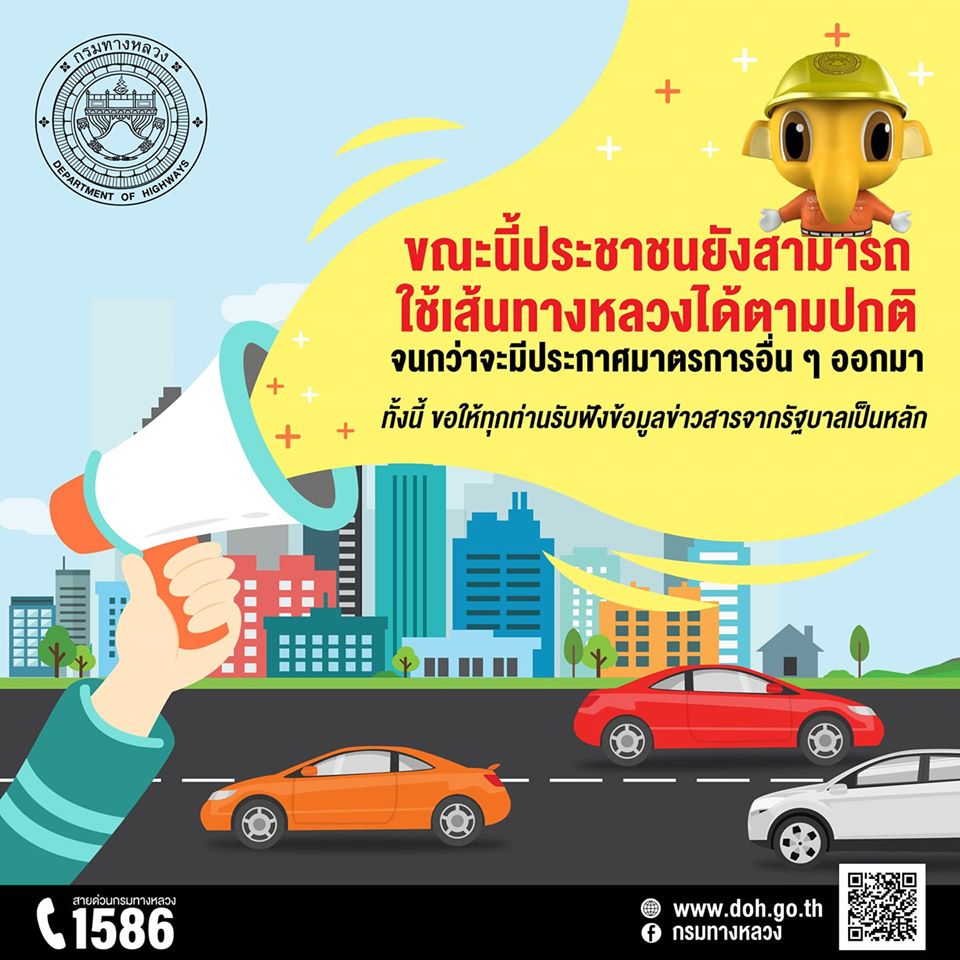 กรมทางหลวงขอเรียนว่า ปัจจุบันยังสามารถเดินทางได้ตามปกติ จนกว่าจะมีการประกาศมาตามมาตรการต่างๆของรัฐบาล