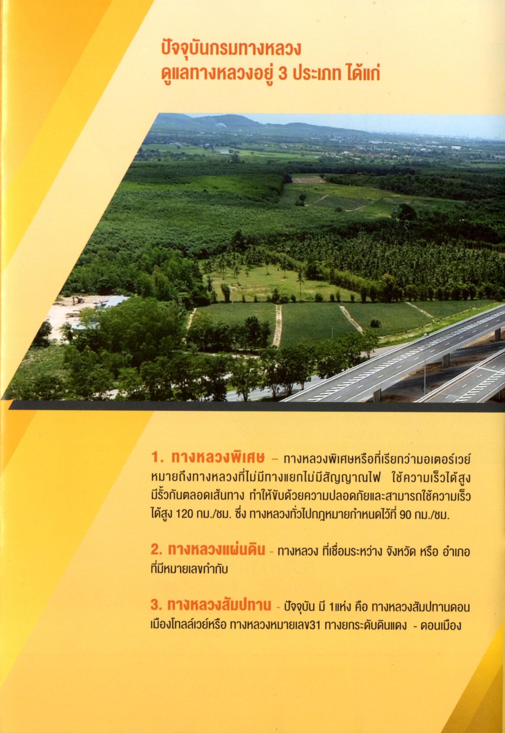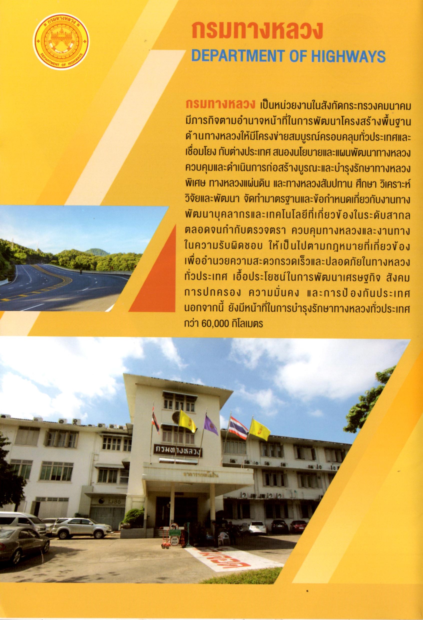 กรมทางหลวง เป็นหน่วยงานในสังกัดกระทรวงคมนาคมมีภารกิจตามอำนาจหน้าที่ในการพัฒนาโครงสร้างพื้นฐานด้านทางหลวงให้มีโครงข่ายสมบูรณ์ครอบคลุมทั่วประเทศและเชื่อมโยง กับต่างประเทศ สนองนโยบายและแผนพัฒนาทางหลวงควบคุมและดำเนินการก่อสร้างบูรณะและบำรุงรักษาทางหลวงพิเศษ ทางหลวงแผ่นดิน และทางหลวงสัปทาน ศึกษา วิเคราะห์ วิจัยและพัฒนา จัดทำมาตรฐานและข้อกำหนดเกี่ยวกับงานทางพัฒนาบุคลากรและเทคโนโลยีที่เกี่ยวข้องในระดับสากลตลอดจนกำกับตรวจตรา ควบคุมทางหลวงและงานทางในความรับผิดชอบ ให้เป็นไปตามกฎหมายที่เกี่ยงข้อง เพื่ออำนวยความสะดวกรวดเร็วและปลอดภัยในทางหลวงทั่วประเทศ เอื้อประโยชน์ในการพัฒนาเศรษฐกิจ สังคมการปกครอง ความมั่นคง และการป้องกันประเทศ นอกจากนี้ ยังมีหน้าที่ในการบำรุงรักษาทางหลวงทั่วประเทศกว่า 60,000 กิโลเมตร