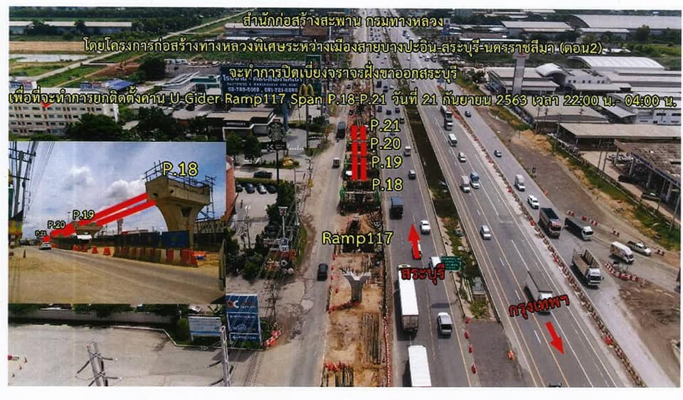 กรมทางหลวง โดยสำนักก่อสร้างสะพานจะทำการปิดเบี่ยงจราจรถนนพหลโยธินฝั่งขาออกไปสระบุรีที่ กม.56+200 พื้นที่ ต.ลำไทร อ.วังน้อย จ.พระนครศรีอยุธยา ในวันที่ 21 กันยายน 2563 เวลา 22.00 น. – 04.00 น. ของวันที่ 22 กันยายน 2563 จึงขอให้ผู้ใช้เส้นทางดังกล่าวเบี่ยงการจราจรโดยใช้ช่องทางพิเศษถนนพหลโยธินฝั่งขาเข้าจำนวน 3 ช่องจราจรทดแทน เนื่องจากได้มีการยกติดตั้งคาน U-Girder โครงการก่อสร้างทางหลวงพิเศษระหว่างเมืองสาย บางปะอิน-สระบุรี-นครราชสีมา (ตอน 2)