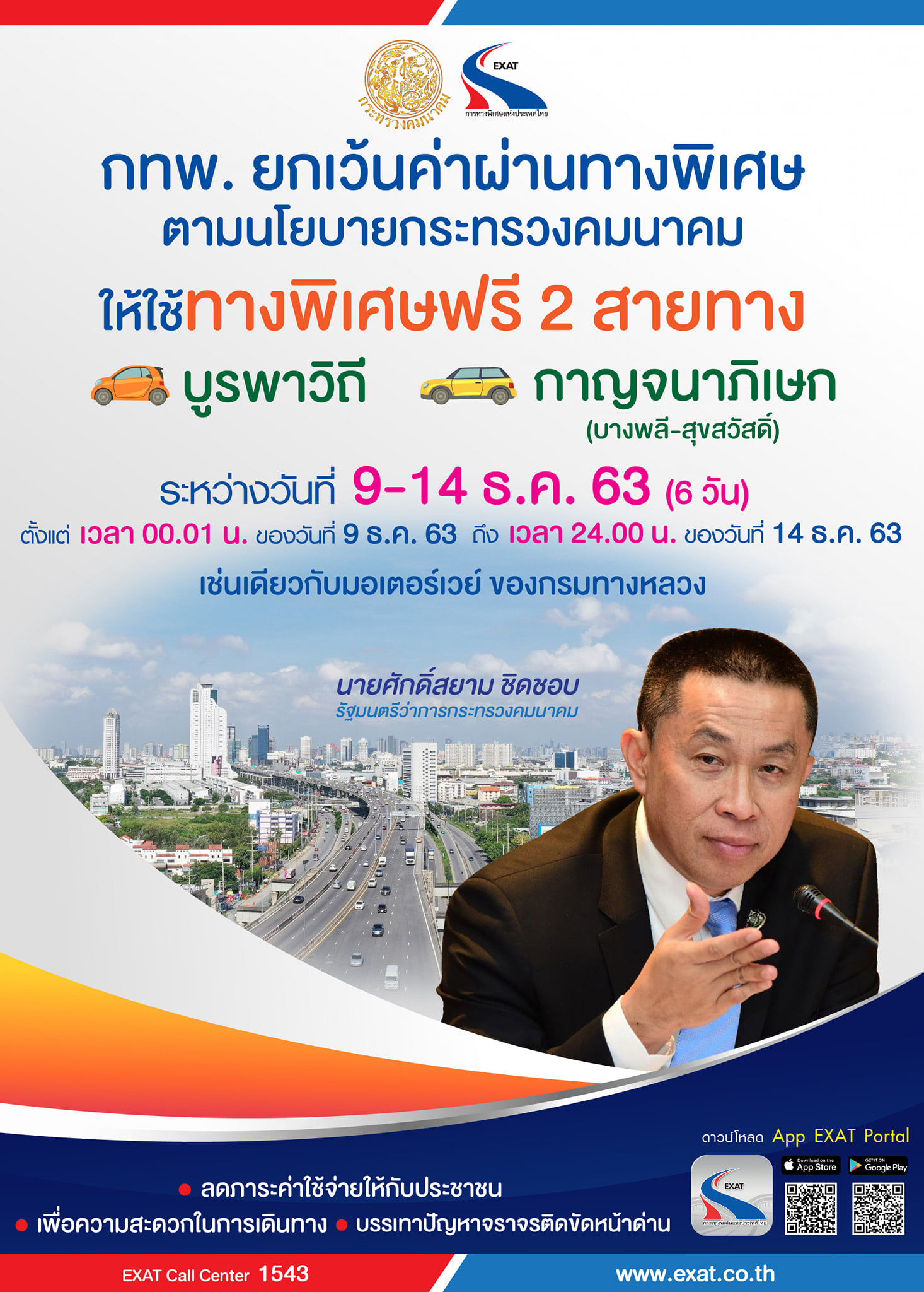 การทางพิเศษแห่งประเทศไทย (กทพ.) กระทรวงคมนาคม กำหนดยกเว้นค่าผ่านทางพิเศษ 2 สายทาง