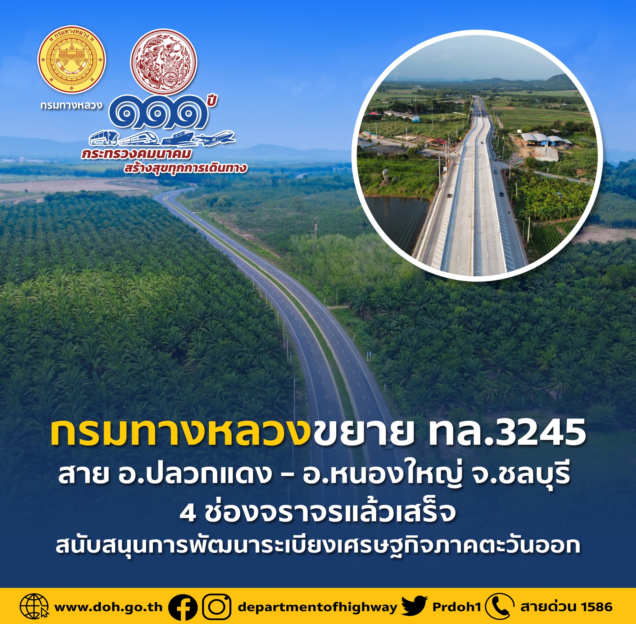 กรมทางหลวง โดยสำนักก่อสร้างทางที่ 2 ได้ดำเนินโครงการก่อสร้างขยายทางหลวงหมายเลข 3245 สาย อ.ปลวกแดง – อ.หนองใหญ่ จ.ชลบุรี ระหว่าง กม.22+142 – กม.34+000 จาก 2 ช่องจราจร เป็น 4 ช่องจราจร แล้วเสร็จ ระยะทาง 11.85 กิโลเมตร ตามแผนงานบูรณาการพัฒนาระบบทางหลวงเพื่อรองรับระเบียงเศรษฐกิจภาคตะวันออก