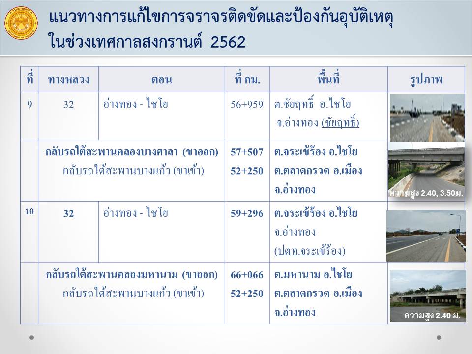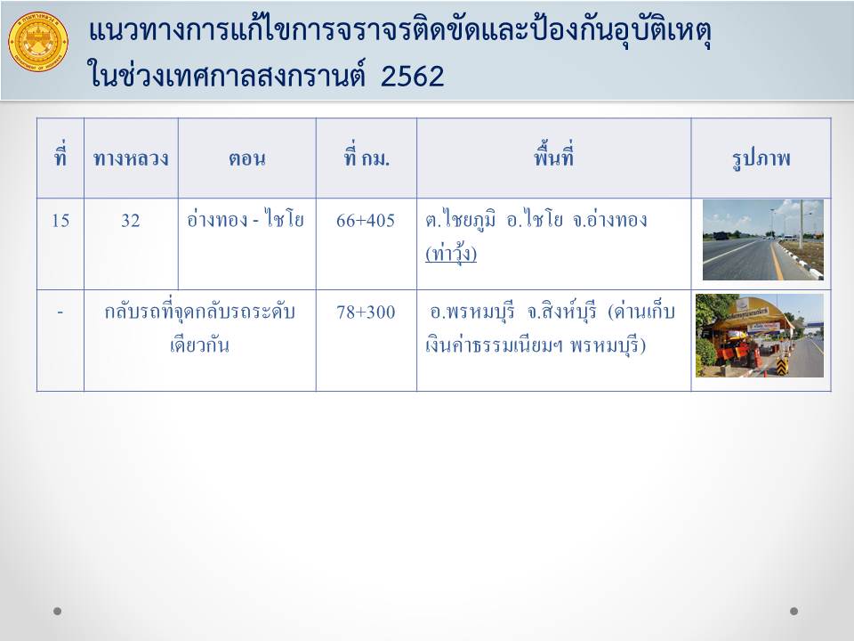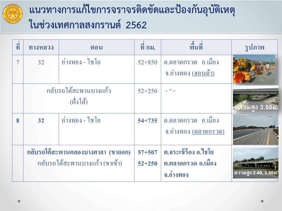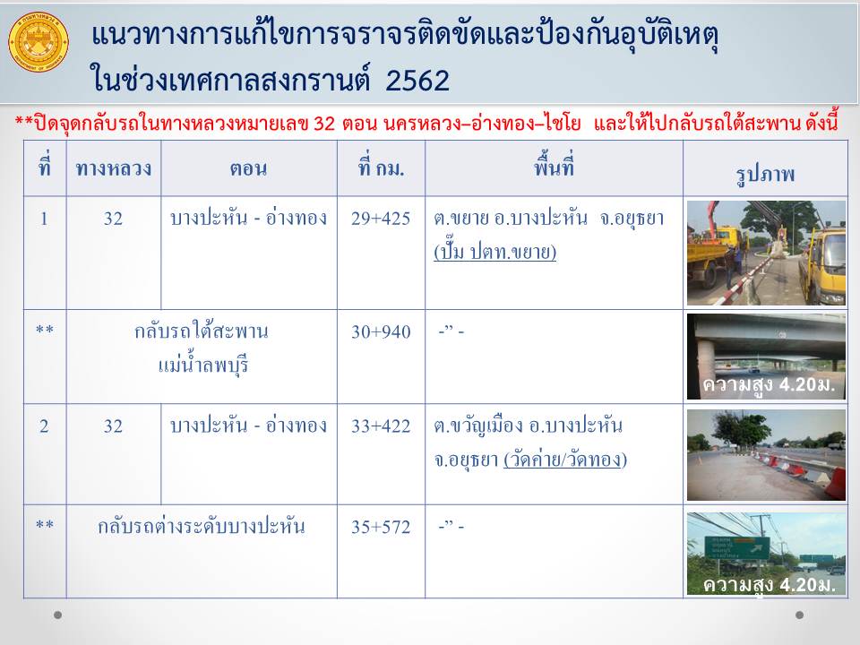ด้วยเทศกาลสงกรานต์ 2562 จะมีประชาชนสัญจรในเส้นทางสายหลักจำนวนมาก เพื่อให้เกิดความปลอดภัยในการเดินทาง และลดจุดเสี่ยงที่จะทำให้เกิดอุบัติเหตุทางถนนสายหลัก แขวงทางหลวงอ่างทองจึงได้ทำการปิดจุดกลับรถบนทางหลวงหมายเลข 32 ตอน นครหลวง - อ่างทอง –ไชโย จำนวน 15 แห่ง เป็นการชั่วคราว