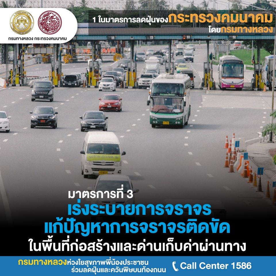 กรมทางหลวงเปิด 8 ปฏิบัติการต่อเนื่อง ลุยแก้ไขปัญหามลพิษ PM 2.5เปิด 8 ปฏิบัติการกรมทางหลวง ลุยแก้ปัญหาฝุ่น PM 2.5 อย่างต่อเนื่อง หวังลดผลกระทบประชาชน โดยการเข้มงวดงานก่อสร้าง-บำรุงทางให้ก่อฝุ่นน้อยที่สุด ติดตั้งเครื่องปล่อยละอองน้ำจับฝุ่น 15 แห่ง ร่วมมือหลายหน่วยงานเข้มใช้รถควันดำ จอดแช่ ลดค่าธรรมเนียมผ่านทาง M-Pass และEasy Pass จูงใจใช้เพิ่ม ลดปัญหารถติดหน้าด่านก่อมลพิษ
