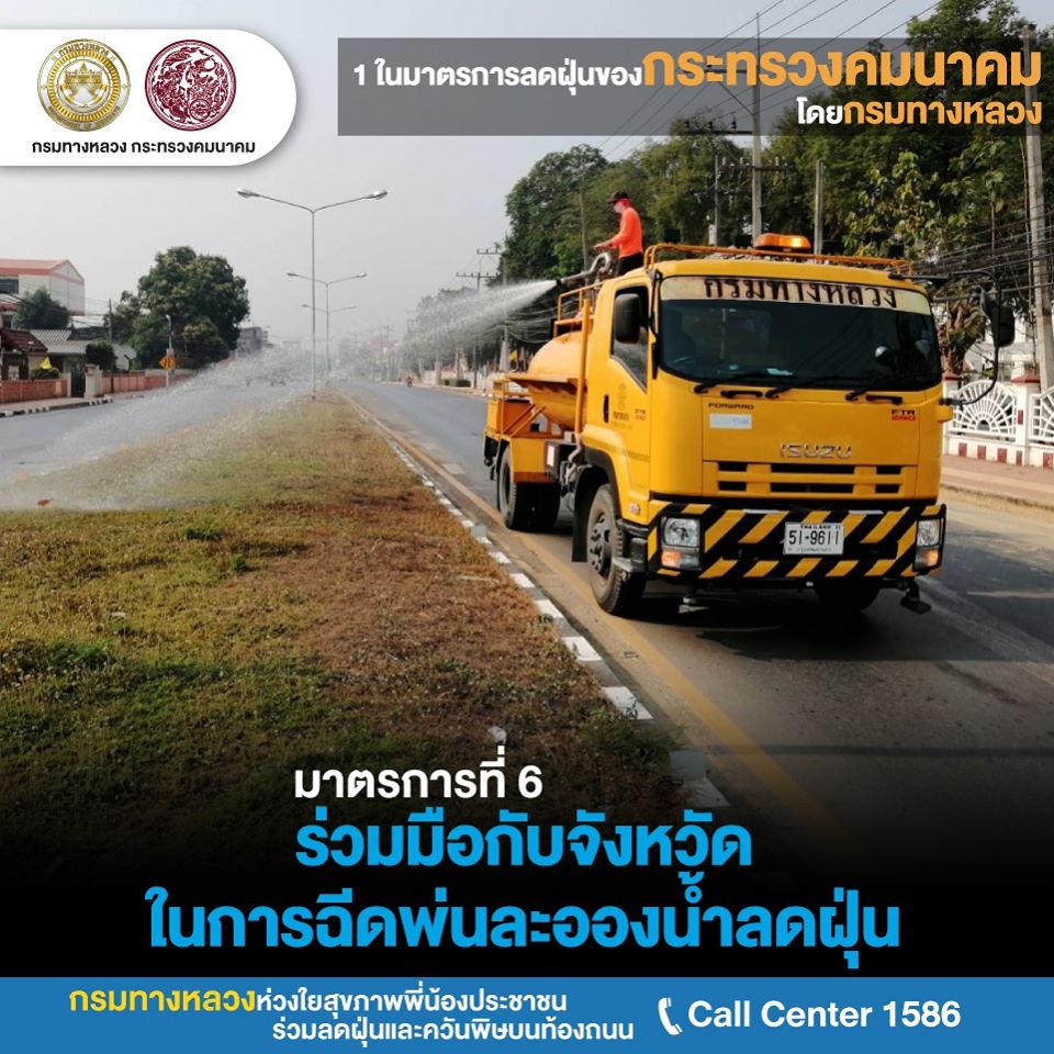 มาตรการที่หก การประสานความร่วมมือกับจังหวัดในการฉีดพ่นละอองน้ำลดฝุ่น และการบำรุงรักษาต้นไม้ริมทางหลวงให้อยู่ในสภาพดี เพื่อช่วยจับฝุ่นละอองจากถนน