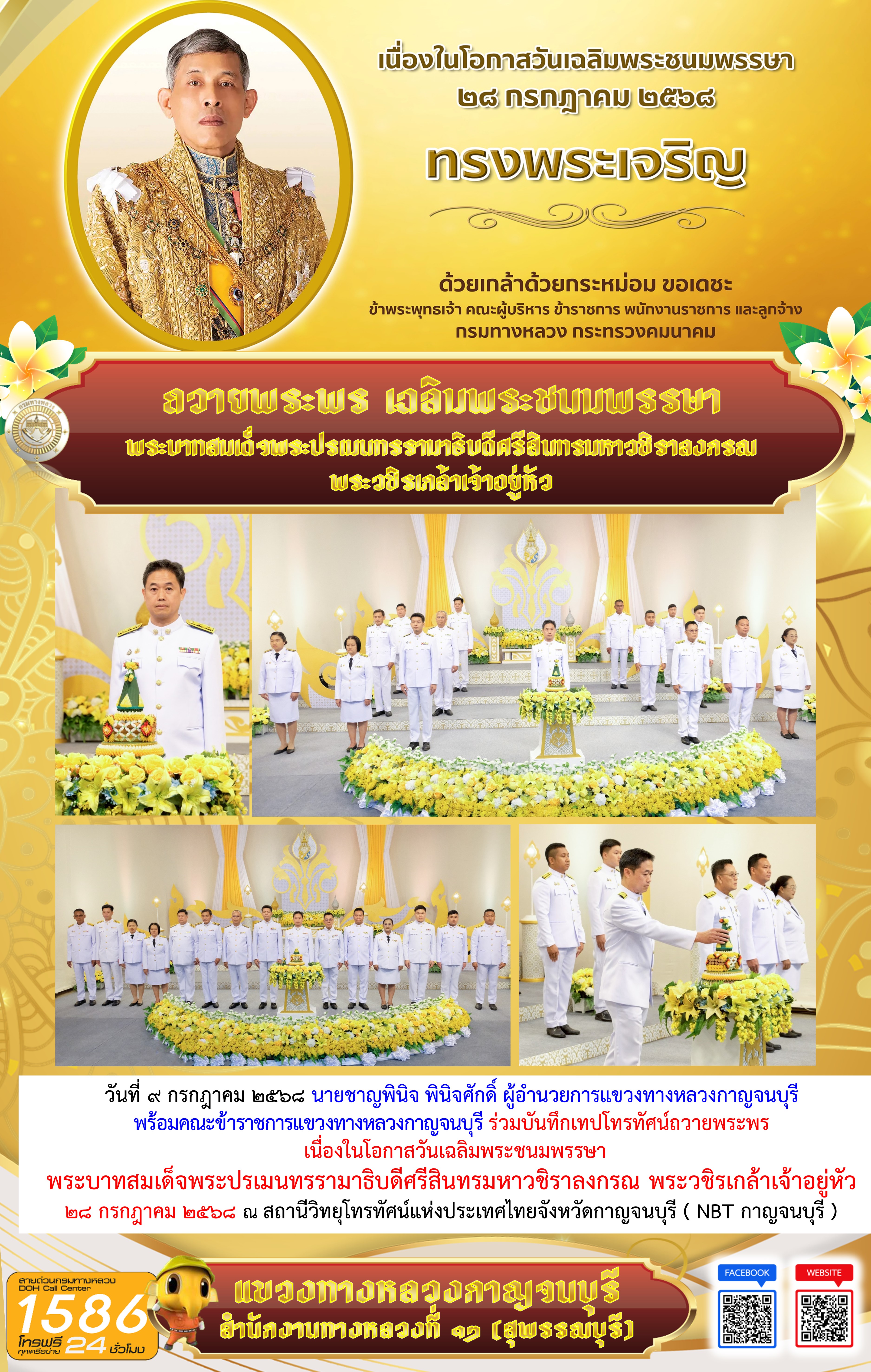 วันที่ ๙ กรกฎาคม ๒๕๖๘ นายชาญพินิจ พินิจศักดิ์ ผู้อำนวยการแขวงทางหลวงกาญจนบุรี พร้อมคณะข้าราชการแขวงทางหลวงกาญจนบุรี ร่วมบันทึกเทปโทรทัศน์ถวายพระพร เนื่องในโอกาสวันเฉลิมพระชนมพรรษา พระบาทสมเด็จพระปรเมนทรรามาธิบดีศรีสินทรมหาวชิราลงกรณ พระวชิรเกล้าเจ้าอยู่หัว 28 กรกฎาคม 2568 ณ สถานีวิทยุโทรทัศน์แห่งประเทศไทยจังหวัดกาญจนบุรี ( NBT กาญจนบุรี )
