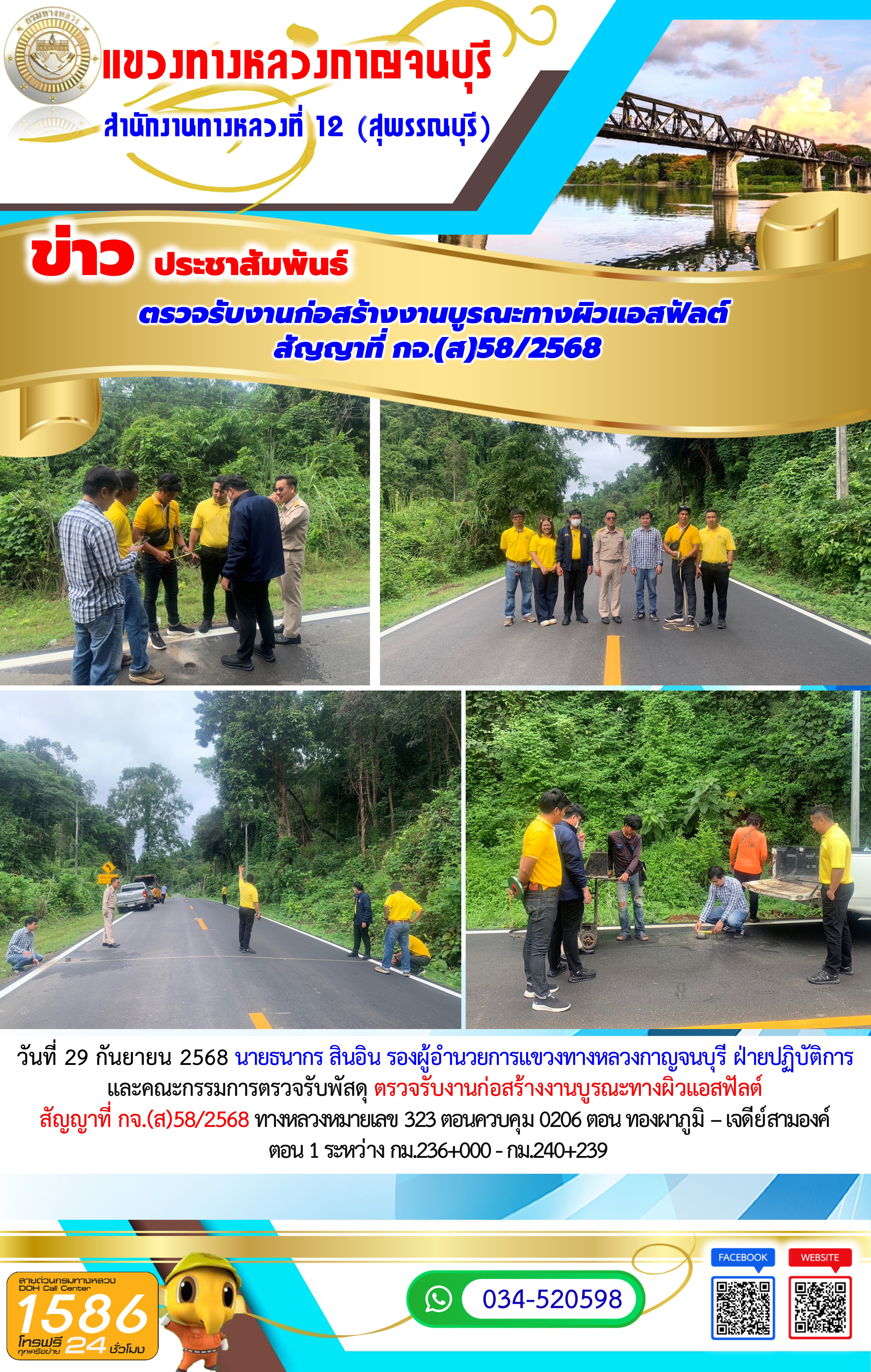 วันที่ 29 กันยายน 2568 นายธนากร สินอิน รองผู้อำนวยการแขวงทางหลวงกาญจนบุรี ฝ่ายปฏิบัติการ และคณะกรรมการตรวจรับพัสดุ ตรวจรับงานก่อสร้างงานบูรณะทางผิวแอสฟัลต์ สัญญาที่ กจ.(ส)58/2568 ทางหลวงหมายเลข 323 ตอนควบคุม 0206 ตอน ทองผาภูมิ – เจดีย์สามองค์ ตอน 1 ระหว่าง กม.236+000 - กม.240+239
