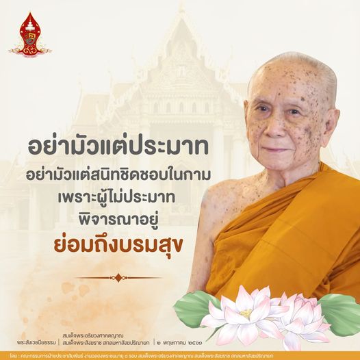 สมเด็จพระสัมมาสัมพุทธเจ้า ทรงพระอนุศาสน์สั่งสอนพุทธบริษัทมิให้ประมาท ดังความตอนหนึ่ง ว่า "อย่ามัวแต่ประมาท อย่ามัวแต่สนิทชิดชอบในกาม เพราะผู้ไม่ประมาท พิจารณาอยู่ ย่อมถึงบรมสุข"