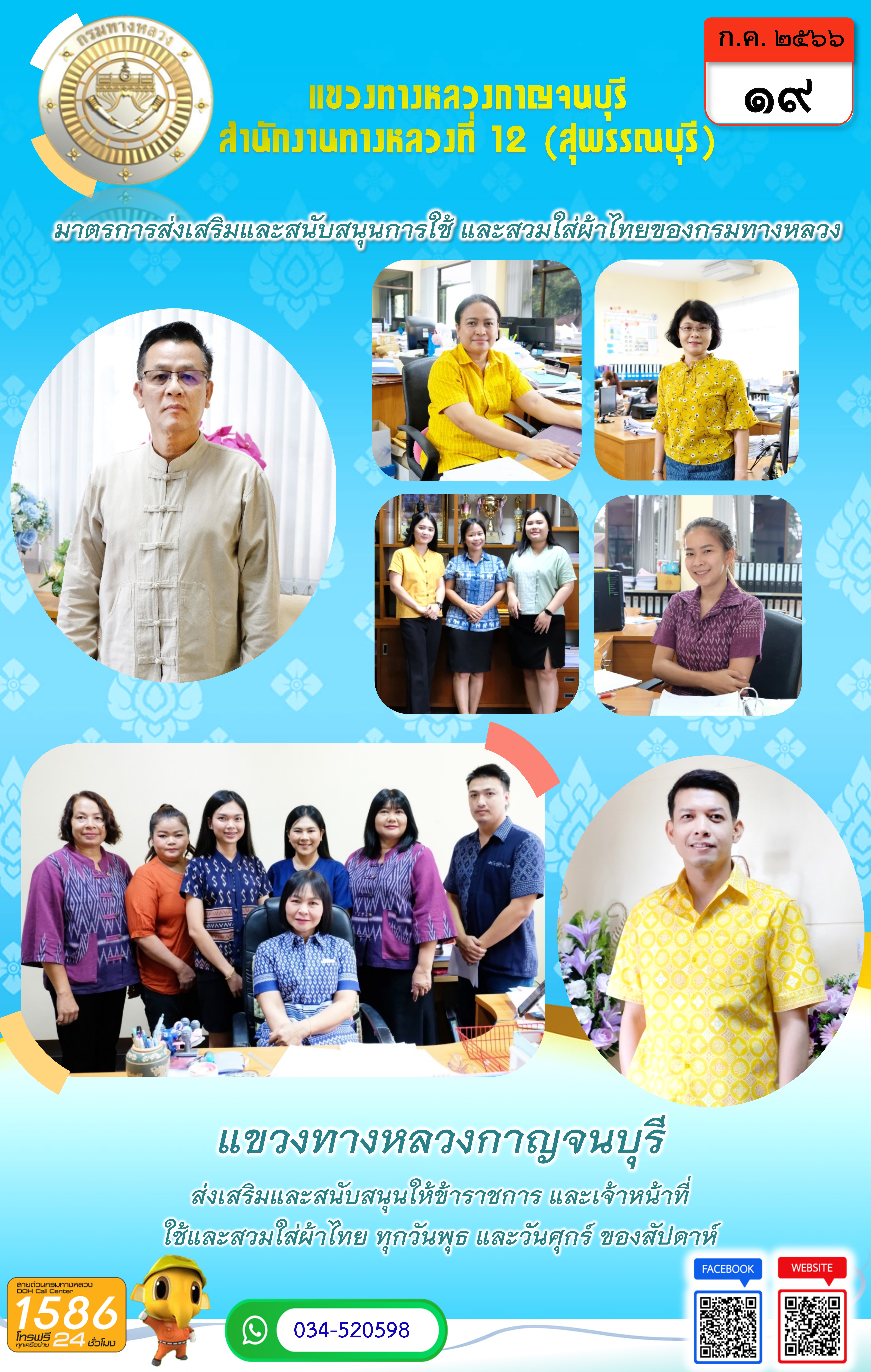 วันที่ 19 ก.ค. 2566 แขวงทางหลวงกาญจนบุรี รณรงค์แต่งกายด้วยผ้าไทยเพื่อส่งเสริมและสนับสนุนการใช้และสวมใส่ผ้าไทย เป็นการอนุรักษ์และสืบสานภูมิปัญญาของไทย สร้างค่านิยมและการตระหนักรับรู้การรักษามรดกและอัตลักษณ์ภูมิปัญญาของไทย