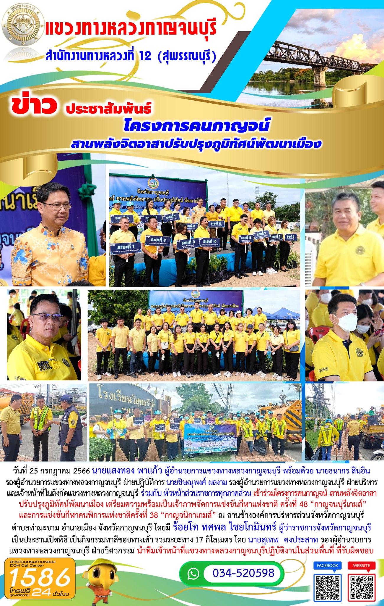 วันที่ 25 กรกฎาคม 2566 นายแสงทอง พาแก้ว ผู้อำนวยการแขวงทางหลวงกาญจนบุรี พร้อมด้วย นายธนากร สินอิน รองผู้อำนวยการแขวงทางหลวงกาญจนบุรี ฝ่ายปฏิบัติการ นายชิษณุพงศ์ ผลงาม รองผู้อำนวยการแขวงทางหลวงกาญจนบุรี ฝ่ายบริหาร และเจ้าหน้าที่ในสังกัดแขวงทางหลวงกาญจนบุรี ร่วมกับ หัวหน้าส่วนราชการทุกภาคส่วน เข้าร่วมโครงการคนกาญจน์ สานพลังจิตอาสาปรับปรุงภูมิทัศน์พัฒนาเมือง เตรียมความพร้อมเป็นเจ้าภาพจัดการแข่งขันกีฬาแห่งชาติ ครั้งที่ 48 “กาญจนบุรีเกมส์”