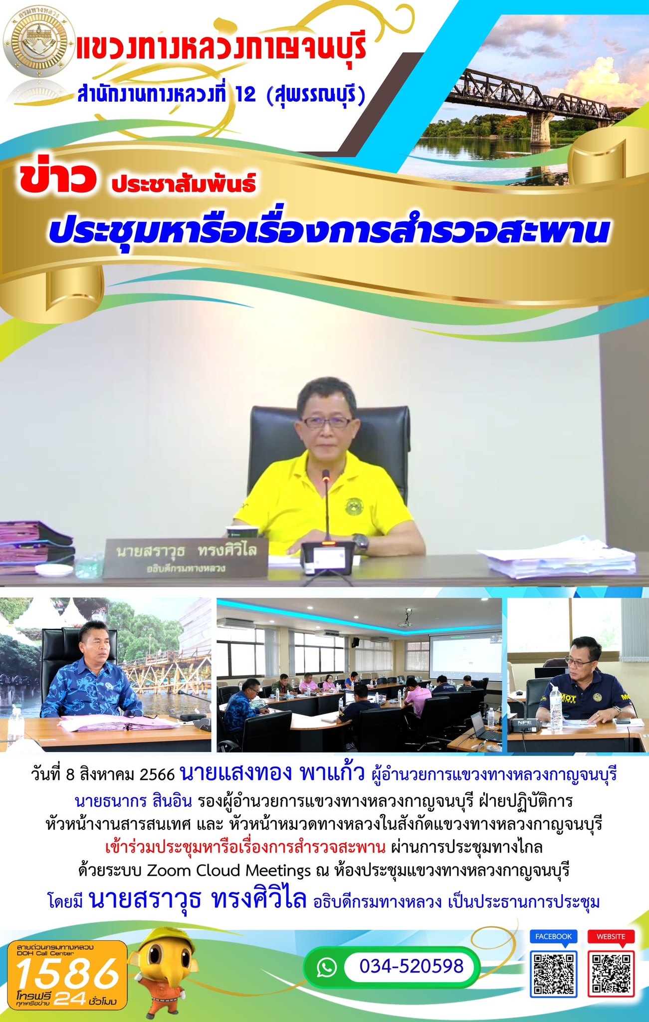 วันที่ 8 สิงหาคม 2566 นายแสงทอง พาแก้ว ผู้อำนวยการแขวงทางหลวงกาญจนบุรี นายธนากร สินอิน รองผู้อำนวยการแขวงทางหลวงกาญจนบุรี ฝ่ายปฏิบัติการ หัวหน้างานสารสนเทศ และ หัวหน้าหมวดทางหลวงในสังกัดแขวงทางหลวงกาญจนบุรี เข้าร่วมประชุมหารือเรื่องการสำรวจสะพาน ผ่านการประชุมทางไกลด้วยระบบ Zoom Cloud Meetings ณ ห้องประชุมแขวงทางหลวงกาญจนบุรี โดยมี นายสราวุธ ทรงศิวิไล อธิบดีกรมทางหลวง เป็นประธานการประชุม