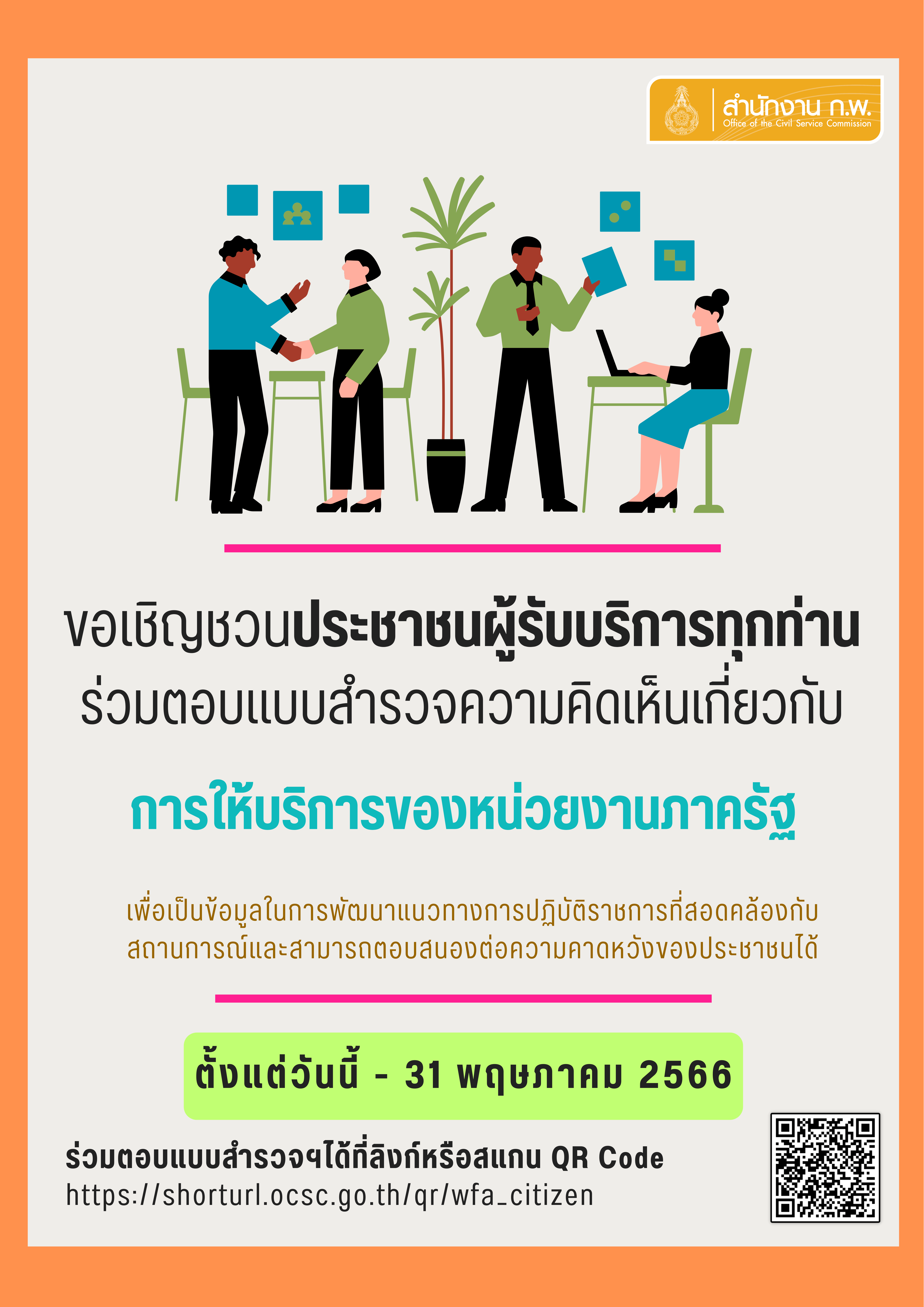 ขอเชิญร่วมตอบแบบสำรวจความพึงพอใจของประชาชนต่อการให้บริการของหน่วยงานของรัฐ ปี พ.ศ. 2566 เพื่อปรับปรุงบริการภาครัฐและอำนวยความสะดวกแก่ประชาชน
