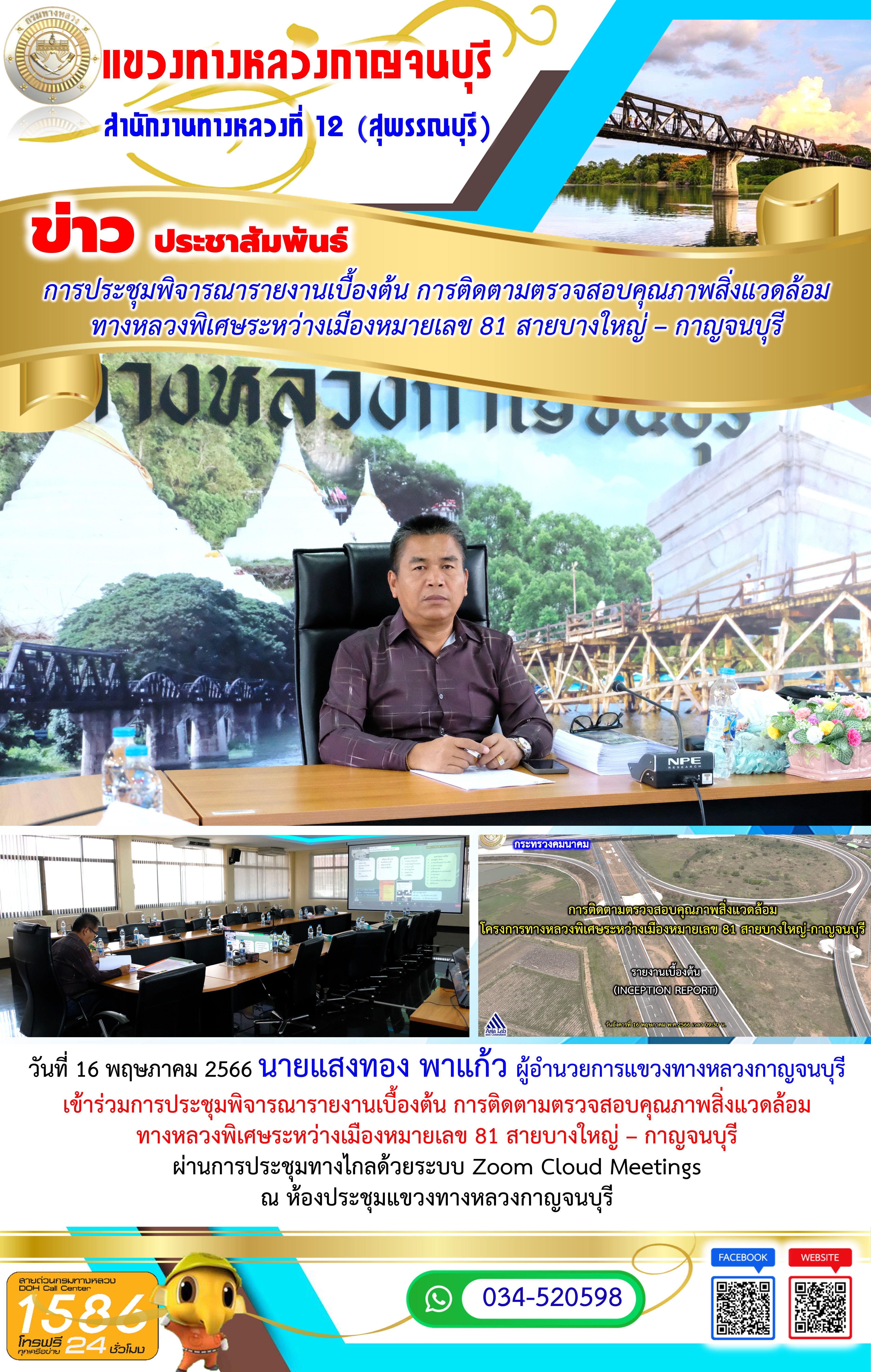 วันที่ 16 พฤษภาคม 2566 นายแสงทอง พาแก้ว ผู้อำนวยการแขวงทางหลวงกาญจนบุรี เข้าร่วมการประชุมพิจารณารายงานเบื้องต้น การติดตามตรวจสอบคุณภาพสิ่งแวดล้อมทางหลวงพิเศษระหว่างเมืองหมายเลข 81 สายบางใหญ่ – กาญจนบุรี ผ่านการประชุมทางไกลด้วยระบบ Zoom Cloud Meetings ณ ห้องประชุมแขวงทางหลวงกาญจนบุรี #กรมทางหลวง #สายด่วนกรมทางหลวง1586 #แขวงทางหลวงกาญจนบุรี โทร 034-520-598