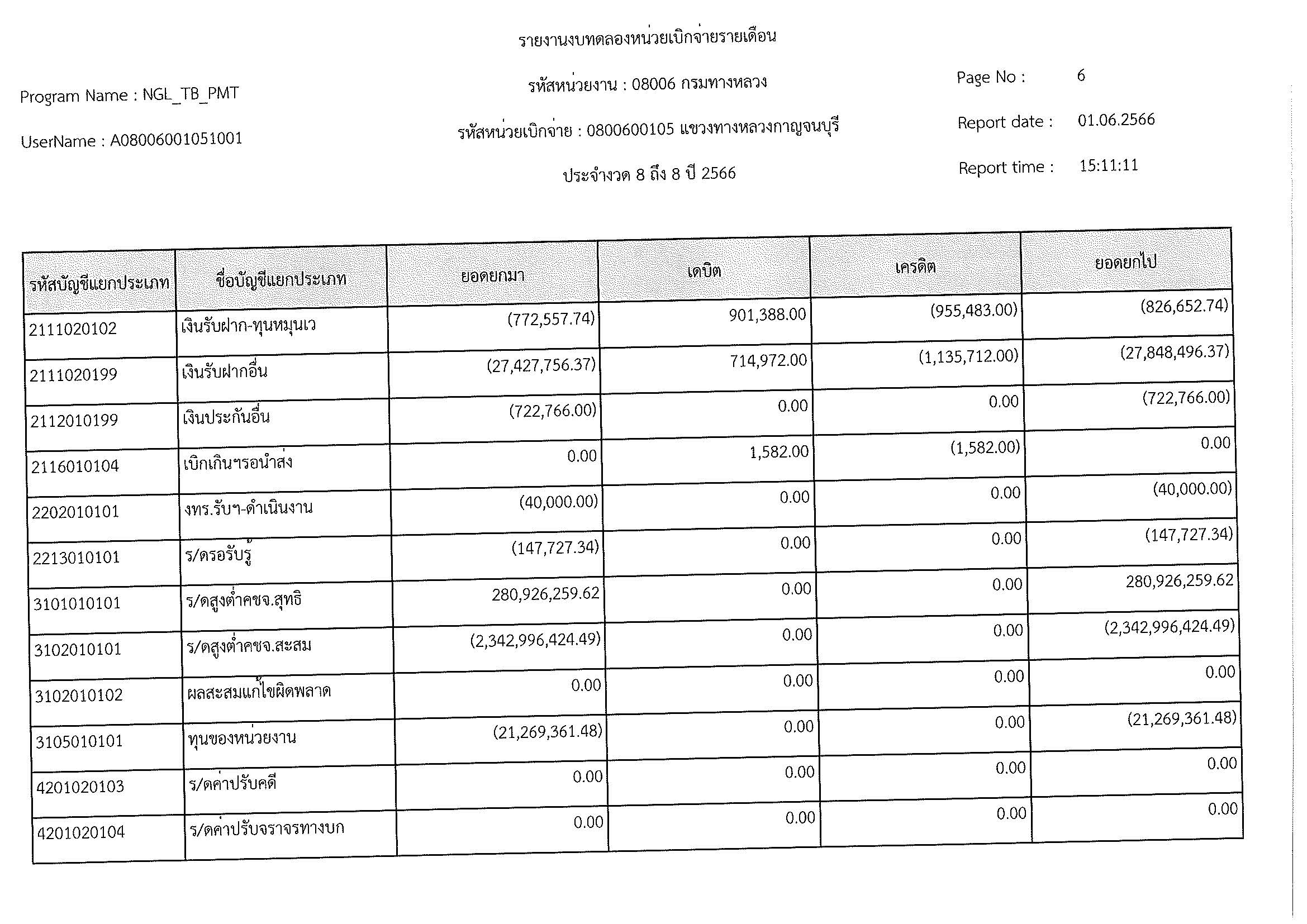 รายงานงบทดลองหน่วยเบิกจ่ายรายเดือน ประจำงวด 8 ประจำปีที่ 2566