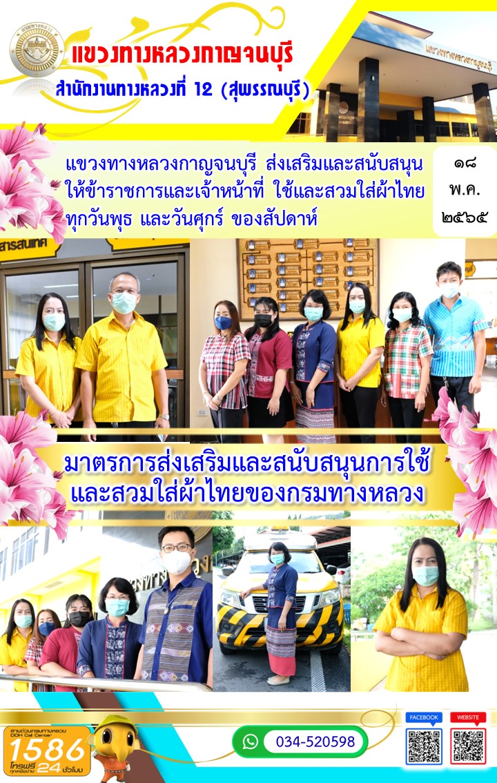 วันที่ 18 พ.ค. 2565 แขวงทางหลวงกาญจนบุรี รณรงค์แต่งกายด้วยผ้าไทย เพื่อส่งเสริมและสนับสนุนการใช้และสวมใส่ผ้าไทย เป็นการอนุรักษ์และสืบสานภูมิปัญญาของไทย สร้างค่านิยมและการตระหนักรับรู้การรักษามรดกและอัตลักษณ์ภูมิปัญญาของไทย