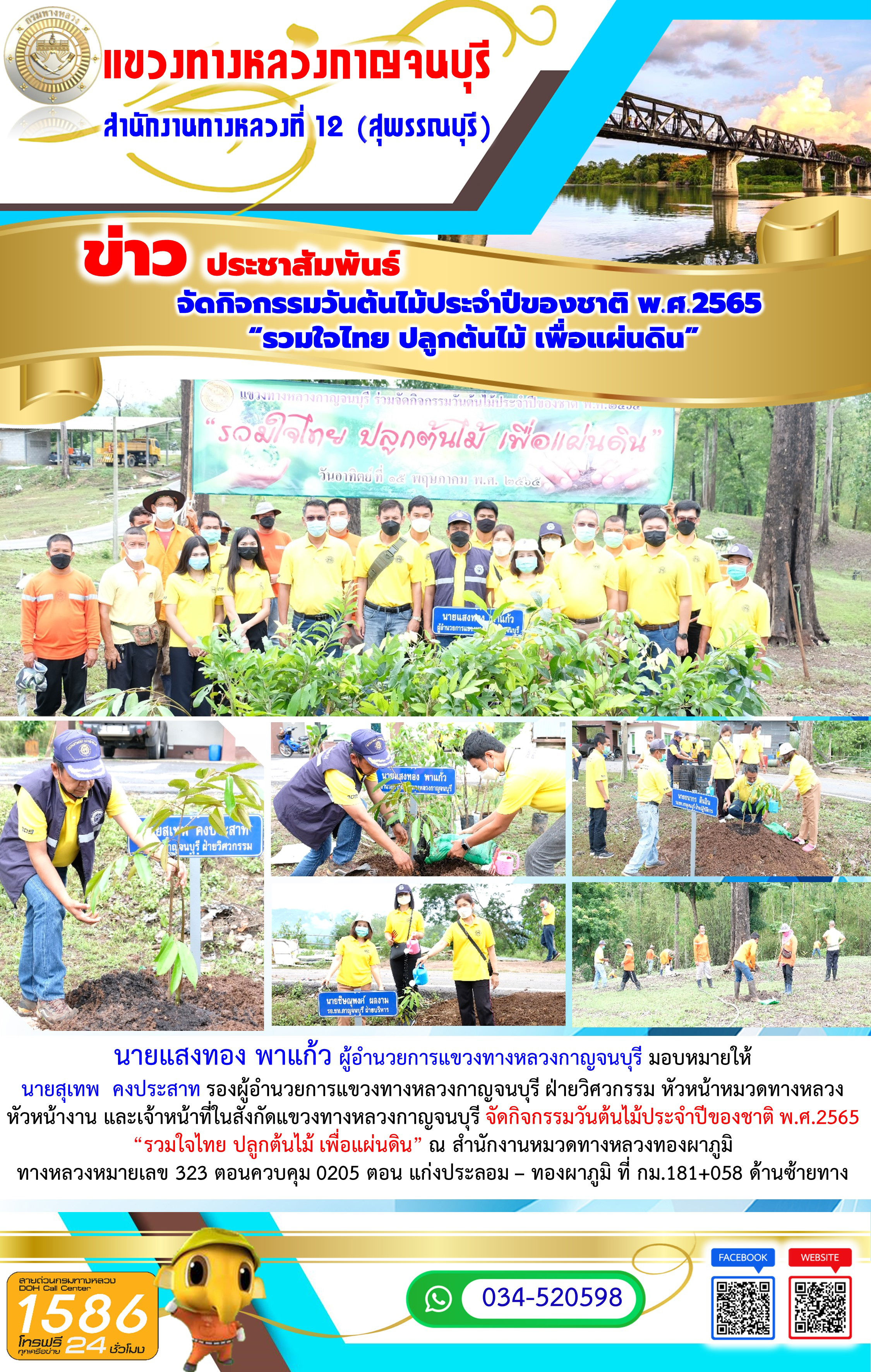 นายแสงทอง พาแก้ว ผู้อำนวยการแขวงทางหลวงกาญจนบุรี มอบหมายให้ นายสุเทพ คงประสาท รองผู้อำนวยการแขวงทางหลวงกาญจนบุรี ฝ่ายวิศวกรรม หัวหน้าหมวดทางหลวงหัวหน้างาน และเจ้าหน้าที่ในสังกัดแขวงทางหลวงกาญจนบุรี จัดกิจกรรมวันต้นไม้ประจำปีของชาติ พ.ศ.2565 “รวมใจไทย ปลูกต้นไม้ เพื่อแผ่นดิน” ณ สำนักงานหมวดทางหลวงทองผาภูมิ ทางหลวงหมายเลข 323 ตอนควบคุม 0205 ตอน แก่งประลอม – ทองผาภูมิ ที่ กม.181+058 ด้านซ้ายทาง