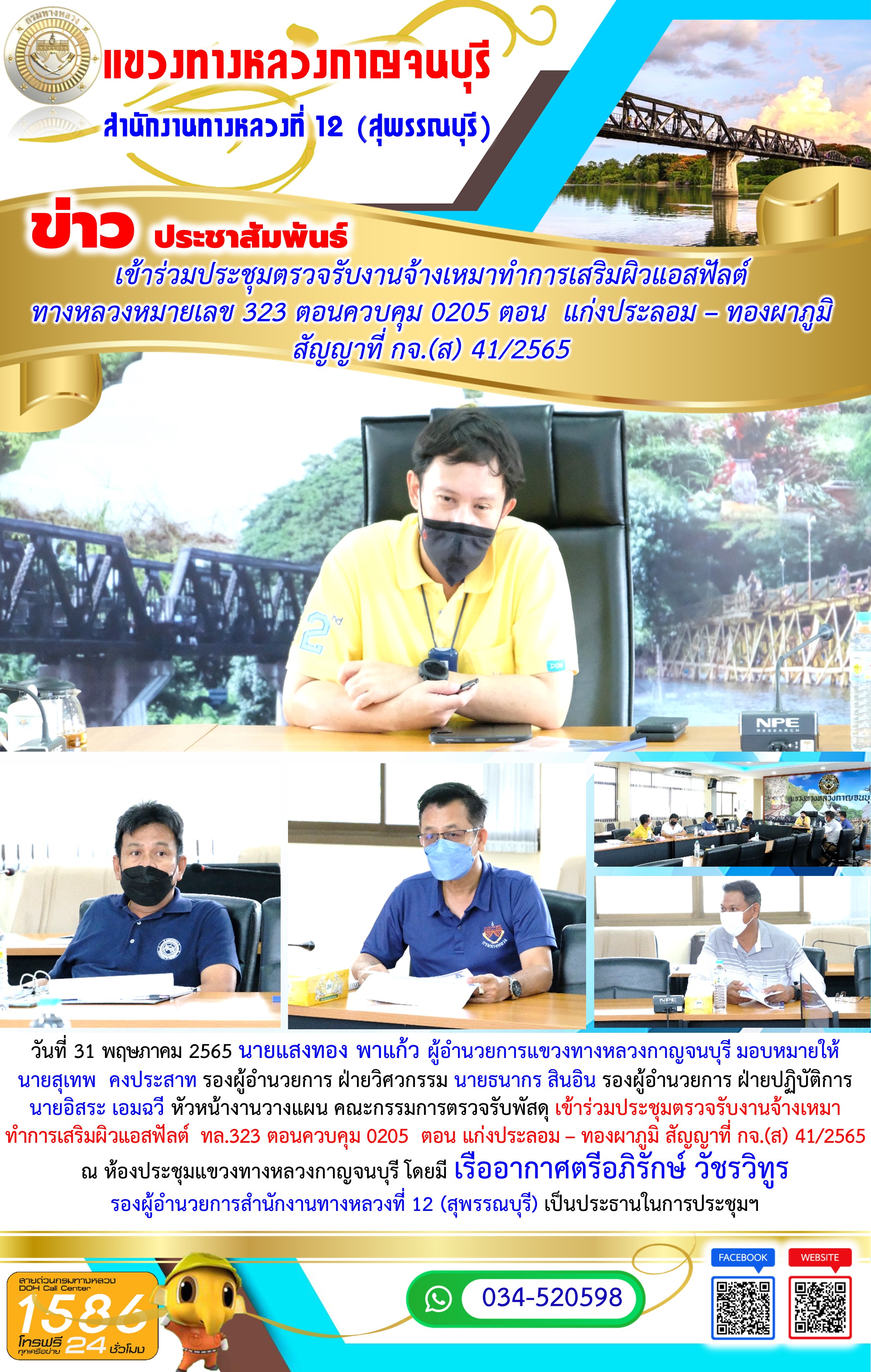 เข้าร่วมประชุมตรวจรับงานจ้างเหมา ทำการเสริมผิวแอสฟัลต์ ทล.323 ตอนควบคุม 0205 ตอน แก่งประลอม – ทองผาภูมิ สัญญาที่ กจ.(ส) 41/2565