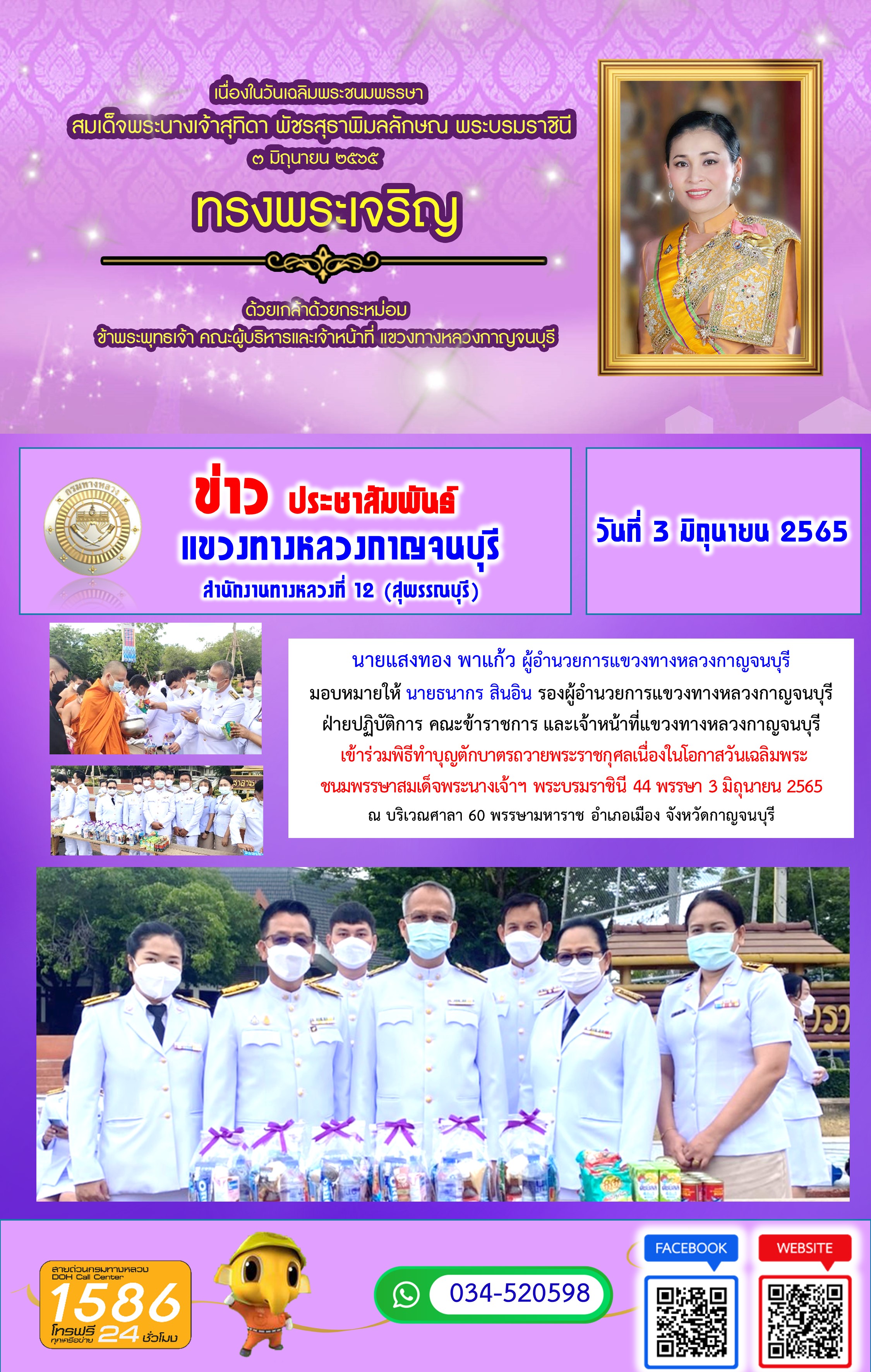 วันที่ 3 มิถุนายน 2565 นายแสงทอง พาแก้ว ผู้อำนวยการแขวงทางหลวงกาญจนบุรี มอบหมายให้ นายอิสระ เอมฉวี หัวหน้างานอำนวยความปลอดภัย คณะข้าราชการ และเจ้าหน้าที่ แขวงทางหลวงกาญจนบุรี เข้าร่วมพิธีถวายเครื่องราชสักการะ วางพานพุ่ม และถวายพระพรชัยมงคล เนื่องในโอกาสวันเฉลิมพระชนมพรรษาสมเด็จพระนางเจ้าฯ พระบรมราชินี 44 พรรษา 3 มิถุนายน 2565 ณ บริเวณศาลา 60 พรรษามหาราช อำเภอเมือง จังหวัดกาญจนบุรี