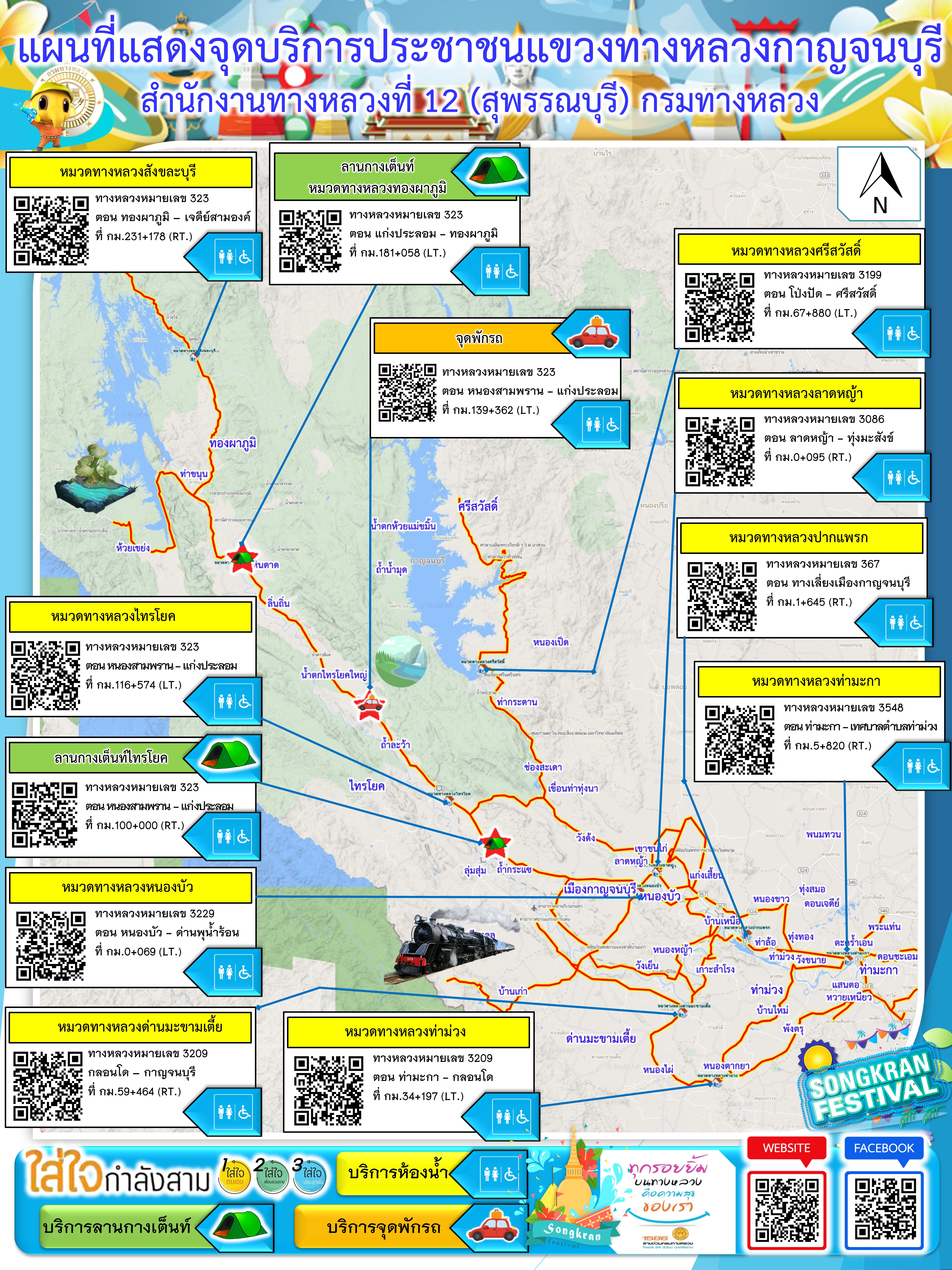 แขวงทางหลวงกาญจนบุรี สำนักงานทางหลวงที่ 12 (สุพรรณบุรี) กรมทางหลวง ให้บริการลานกางเต็นท์ จุดพักรถ ห้องน้ำ และสอบถามข้อมูลต่างๆ สำหรับนักท่องเที่ยวแวะพักใช้บริการ โดยมีเจ้าหน้าที่พร้อมบริการตลอด 24 ชั่วโมง ในช่วงเทศกาลสงกรานต์ 2565