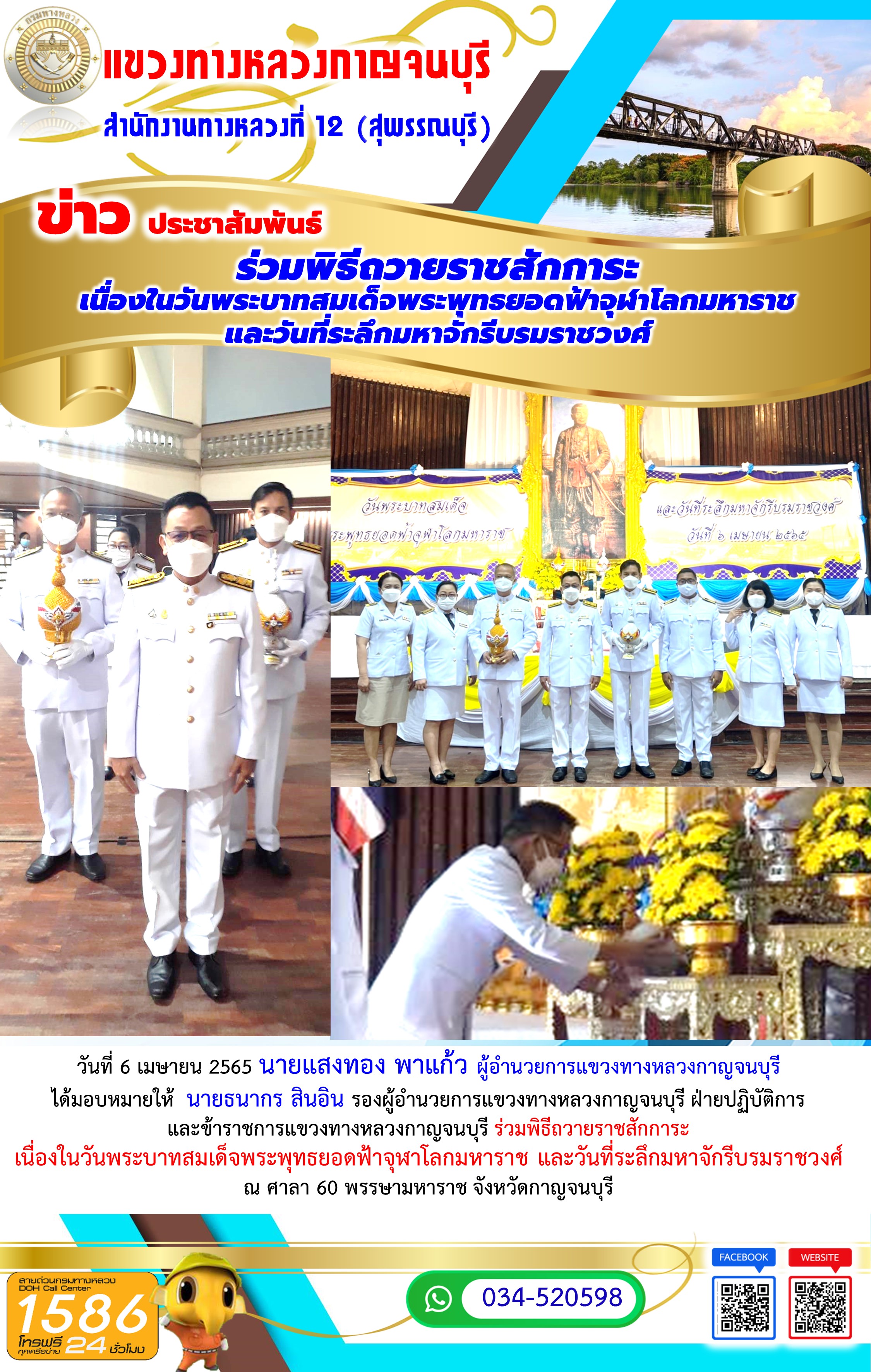 วันที่ 6 เมษายน 2565 นายแสงทอง พาแก้ว ผู้อำนวยการแขวงทางหลวงกาญจนบุรี ได้มอบหมายให้ นายธนากร สินอิน รองผู้อำนวยการแขวงทางหลวงกาญจนบุรี ฝ่ายปฏิบัติการและข้าราชการแขวงทางหลวงกาญจนบุรี ร่วมพิธีถวายราชสักการะเนื่องในวันพระบาทสมเด็จพระพุทธยอดฟ้าจุฬาโลกมหาราช และวันที่ระลึกมหาจักรีบรมราชวงศ์ ณ ศาลา 60 พรรษามหาราช จังหวัดกาญจนบุรี