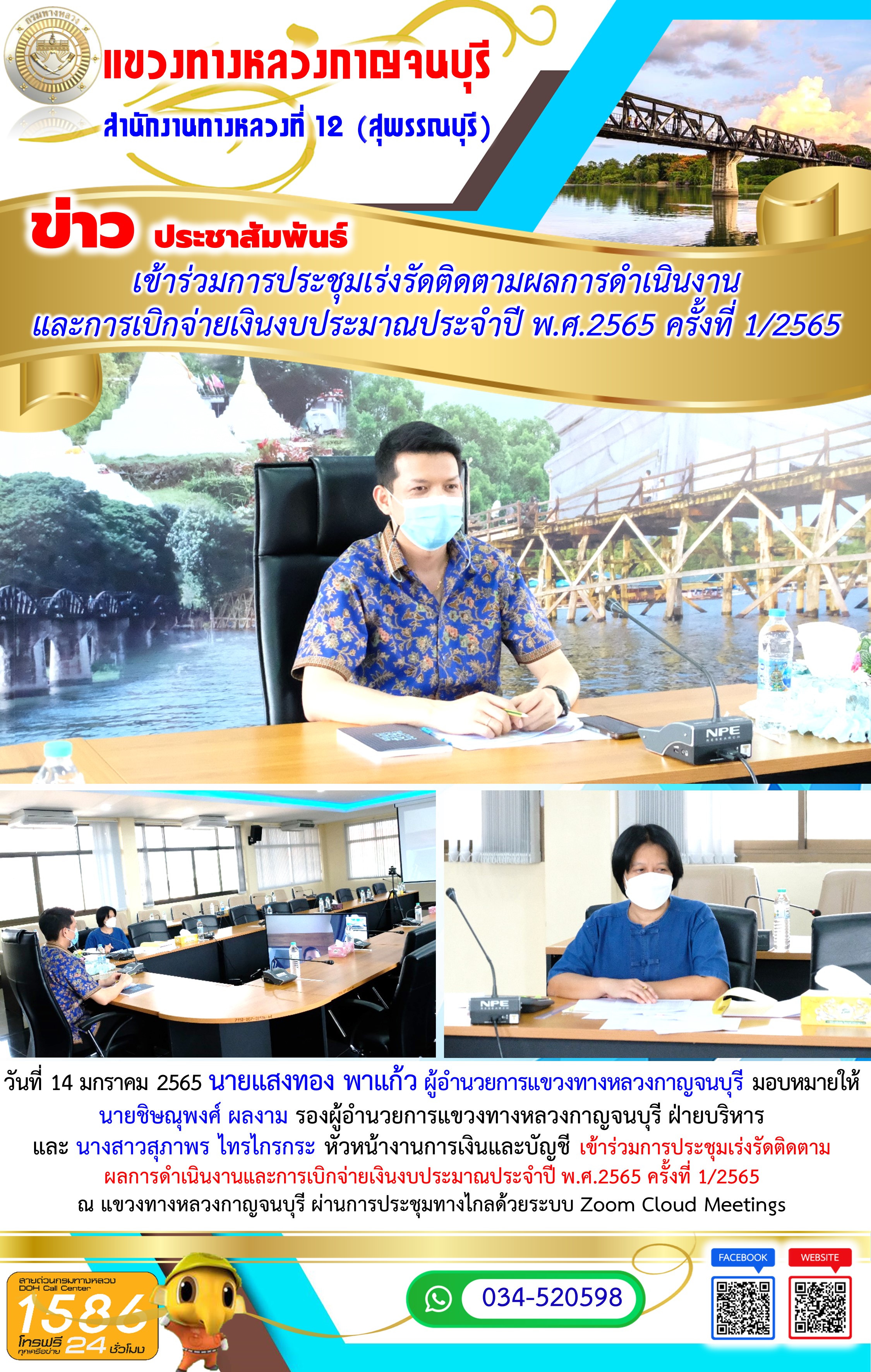 ข้าร่วมการประชุมเร่งรัดติดตาม ผลการดำเนินงานและการเบิกจ่ายเงินงบประมาณประจำปี พ.ศ.2565 ครั้งที่ 1/2565 ณ แขวงทางหลวงกาญจนบุรี ผ่านการประชุมทางไกลด้วยระบบ Zoom Cloud Meetings