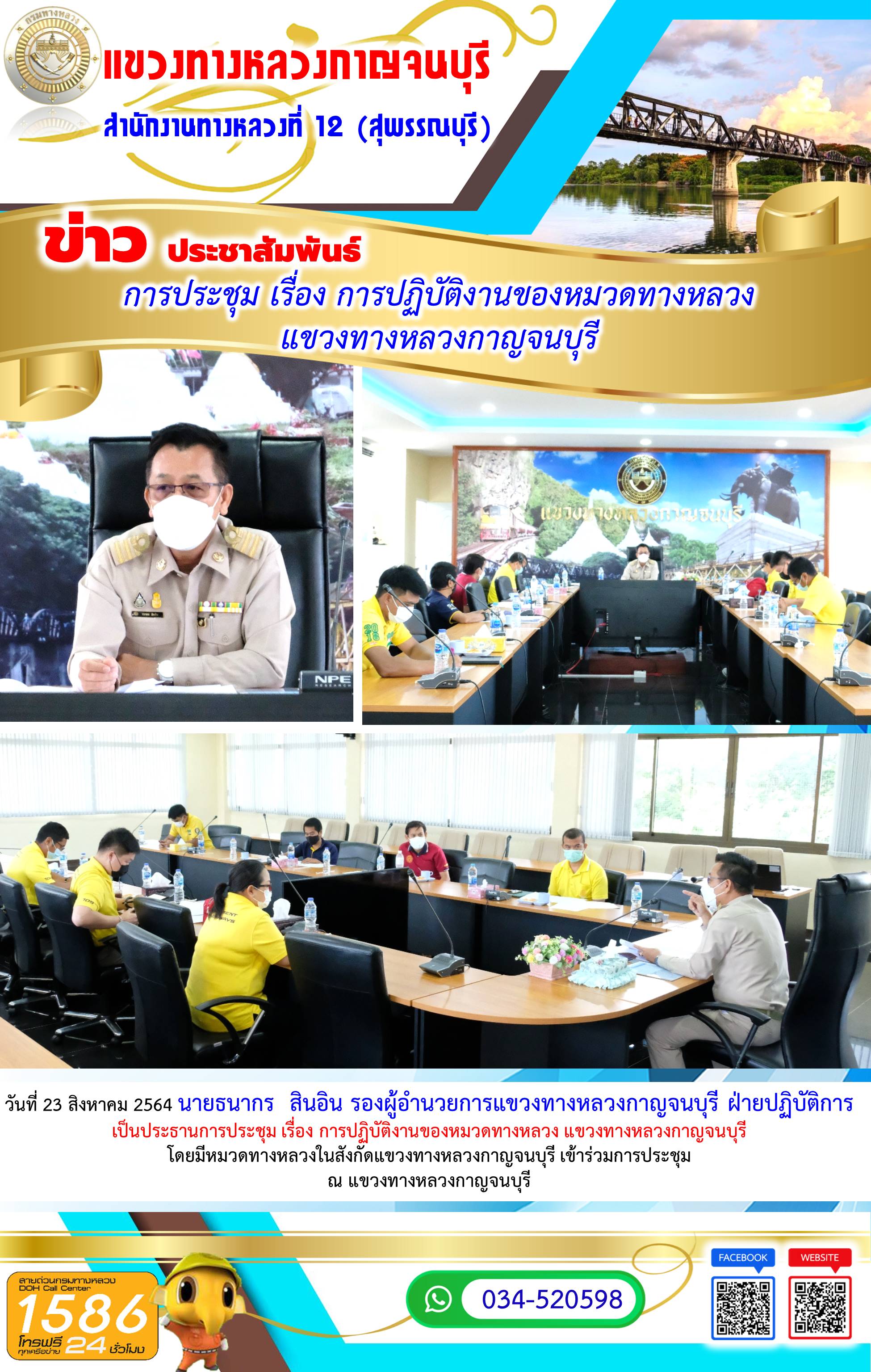 วันที่ 23 สิงหาคม 2564 นายธนากร สินอิน รองผู้อำนวยการแขวงทางหลวงกาญจนบุรี ฝ่ายปฏิบัติการ เป็นประธานการประชุม เรื่อง การปฏิบัติงานของหมวดทางหลวง แขวงทางหลวงกาญจนบุรี โดยมีหมวดทางหลวงในสังกัดแขวงทางหลวงกาญจนบุรี เข้าร่วมการประชุม ณ แขวงทางหลวงกาญจนบุรี #กรมทางหลวง #สายด่วนกรมทางหลวง1586 #แขวงทางหลวงกาญจนบุรี โทร 034-520-598