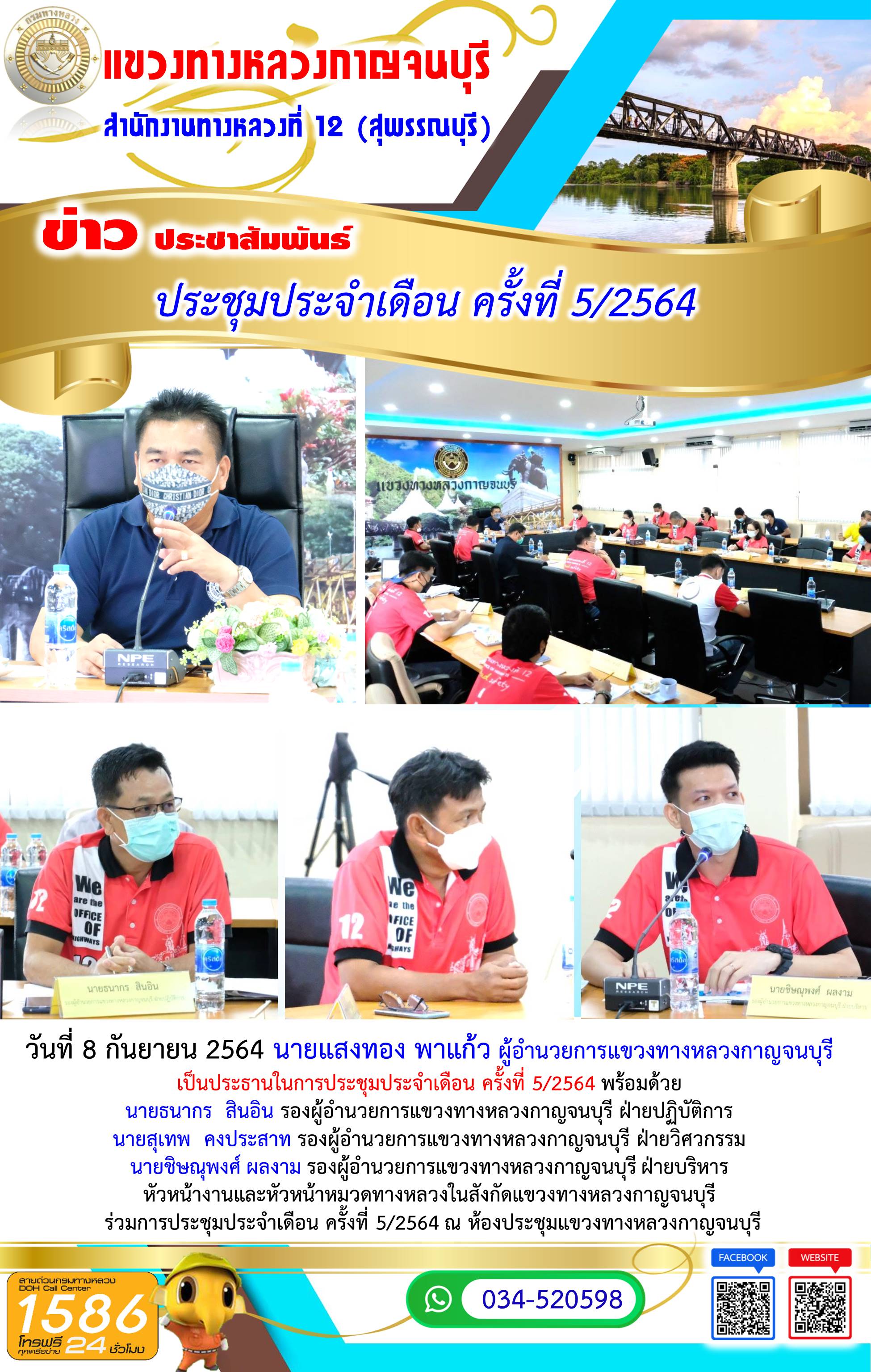 วันที่ 8 กันยายน 2564 นายแสงทอง พาแก้ว ผู้อำนวยการแขวงทางหลวงกาญจนบุรี เป็นประธานในการประชุมประจำเดือน ครั้งที่ 5/2564 พร้อมด้วยนายธนากร สินอิน รองผู้อำนวยการแขวงทางหลวงกาญจนบุรี ฝ่ายปฏิบัติการ นายสุเทพ คงประสาท รองผู้อำนวยการแขวงทางหลวงกาญจนบุรี ฝ่ายวิศวกรรม นายชิษณุพงศ์ ผลงาม รองผู้อำนวยการแขวงทางหลวงกาญจนบุรี ฝ่ายบริหาร หัวหน้างานและหัวหน้าหมวดทางหลวงในสังกัดแขวงทางหลวงกาญจนบุรีร่วมการประชุมประจำเดือน ครั้งที่ 5/2564 ณ ห้องประชุมแขวงทางหลวงกาญจนบุรี