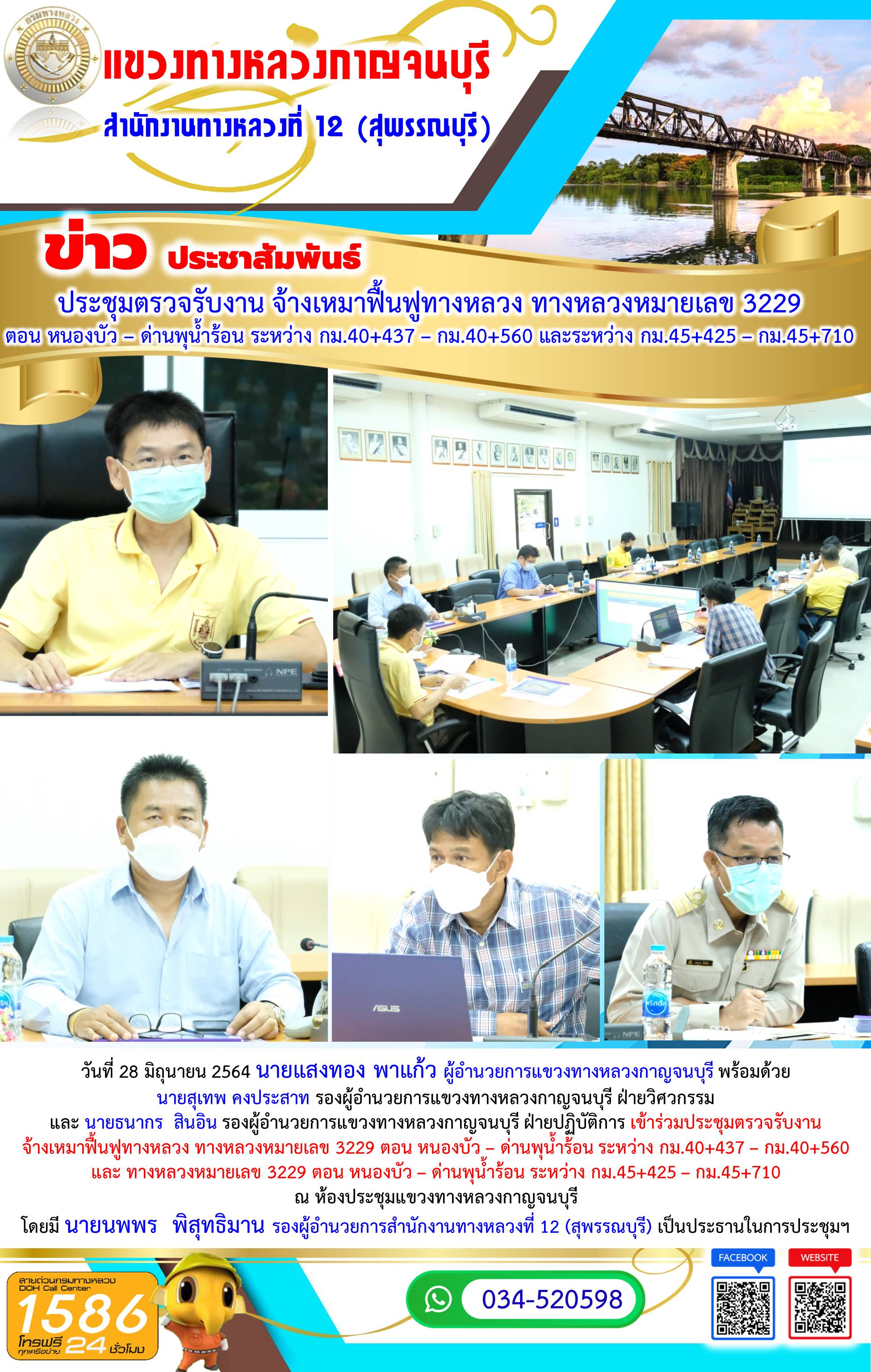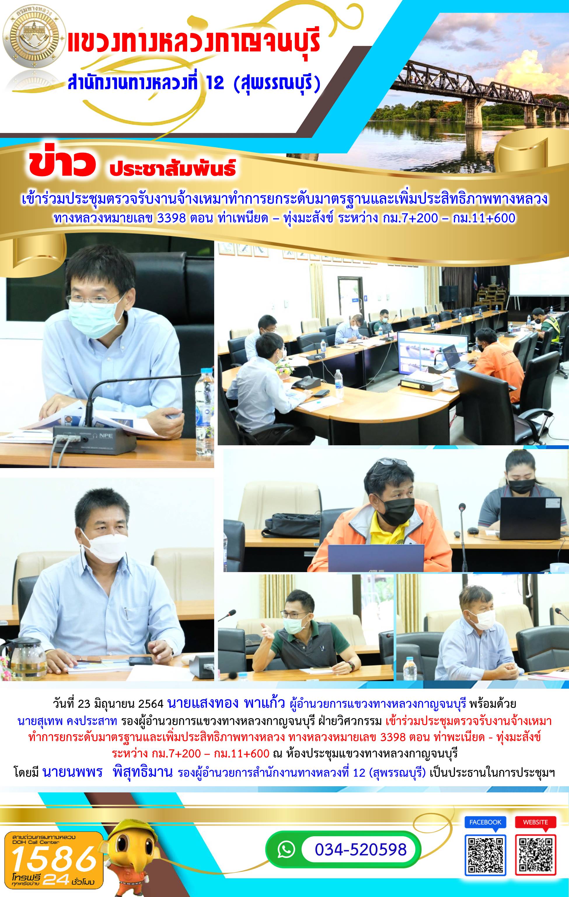 วันที่ 23 มิถุนายน 2564 นายแสงทอง พาแก้ว ผู้อำนวยการแขวงทางหลวงกาญจนบุรี พร้อมด้วย นายสุเทพ คงประสาท รองผู้อำนวยการแขวงทางหลวงกาญจนบุรี ฝ่ายวิศวกรรม เข้าร่วมประชุมตรวจรับงานจ้างเหมา ทำการยกระดับมาตรฐานและเพิ่มประสิทธิภาพทางหลวง ทางหลวงหมายเลข 3398 ตอน ท่าพะเนียด - ทุ่งมะสังข์ ระหว่าง กม.7+200 – กม.11+600 ณ ห้องประชุมแขวงทางหลวงกาญจนบุรี โดยมี นายนพพร พิสุทธิมาน รองผู้อำนวยการสำนักงานทางหลวงที่ 12 (สุพรรณบุรี) เป็นประธานในการประชุมฯ