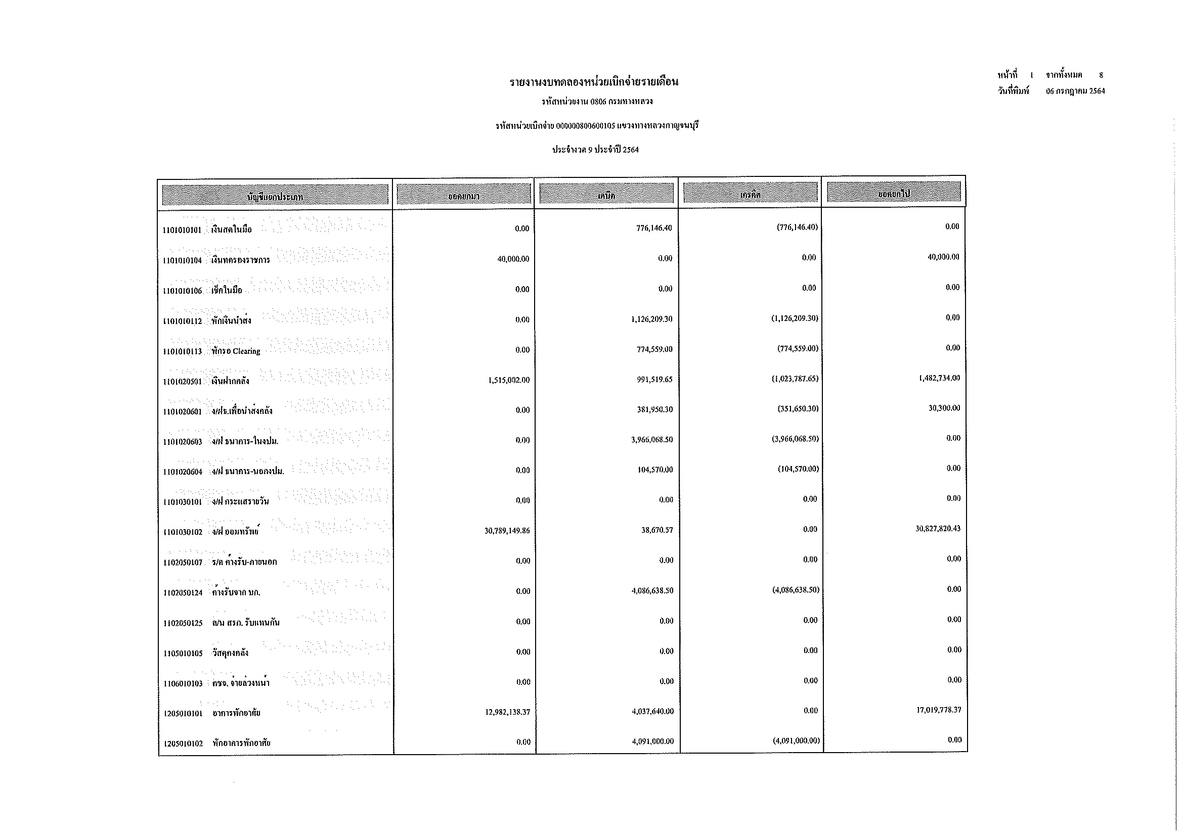 รายงานงบทดลองหน่วยเบิกจ่ายรายเดือน ประจำงวด 8 ประจำปีที่ 2564