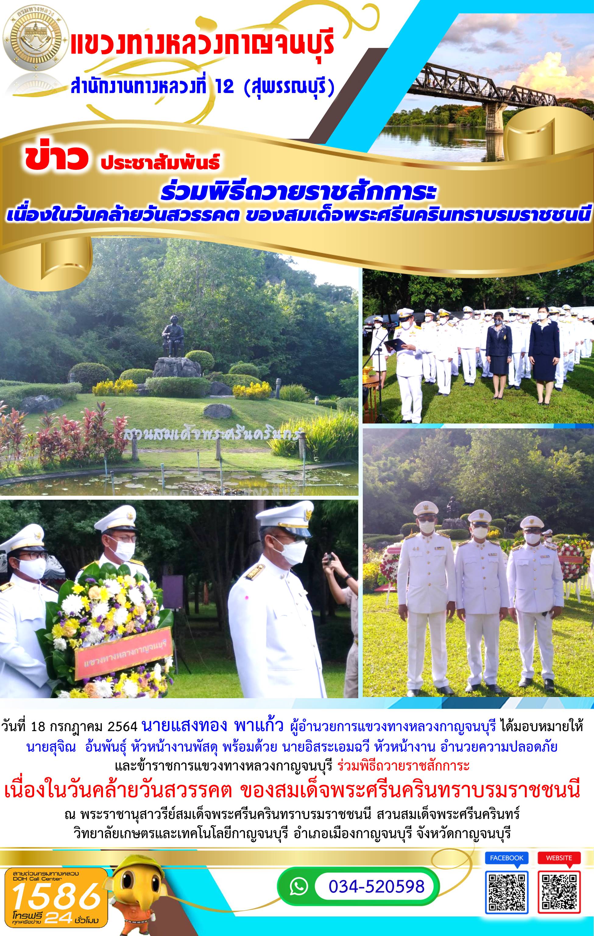 วันที่ 18 กรกฎาคม 2564 นายแสงทอง พาแก้ว ผู้อำนวยการแขวงทางหลวงกาญจนบุรี ได้มอบหมายให้ นายสุจิณ อ้นพันธุ์ หัวหน้างานพัสดุ พร้อมด้วย นายอิสระเอมฉวี หัวหน้างาน อำนวยความปลอดภัย และข้าราชการแขวงทางหลวงกาญจนบุรี ร่วมพิธีถวายราชสักการะเนื่องในวันคล้ายวันสวรรคต ของสมเด็จพระศรีนครินทราบรมราชชนนี ณ พระราชานุสาวรีย์สมเด็จพระศรีนครินทราบรมราชชนนี สวนสมเด็จพระศรีนครินทร์ วิทยาลัยเกษตรและเทคโนโลยีกาญจนบุรี อำเภอเมืองกาญจนบุรี จังหวัดกาญจนบุรี