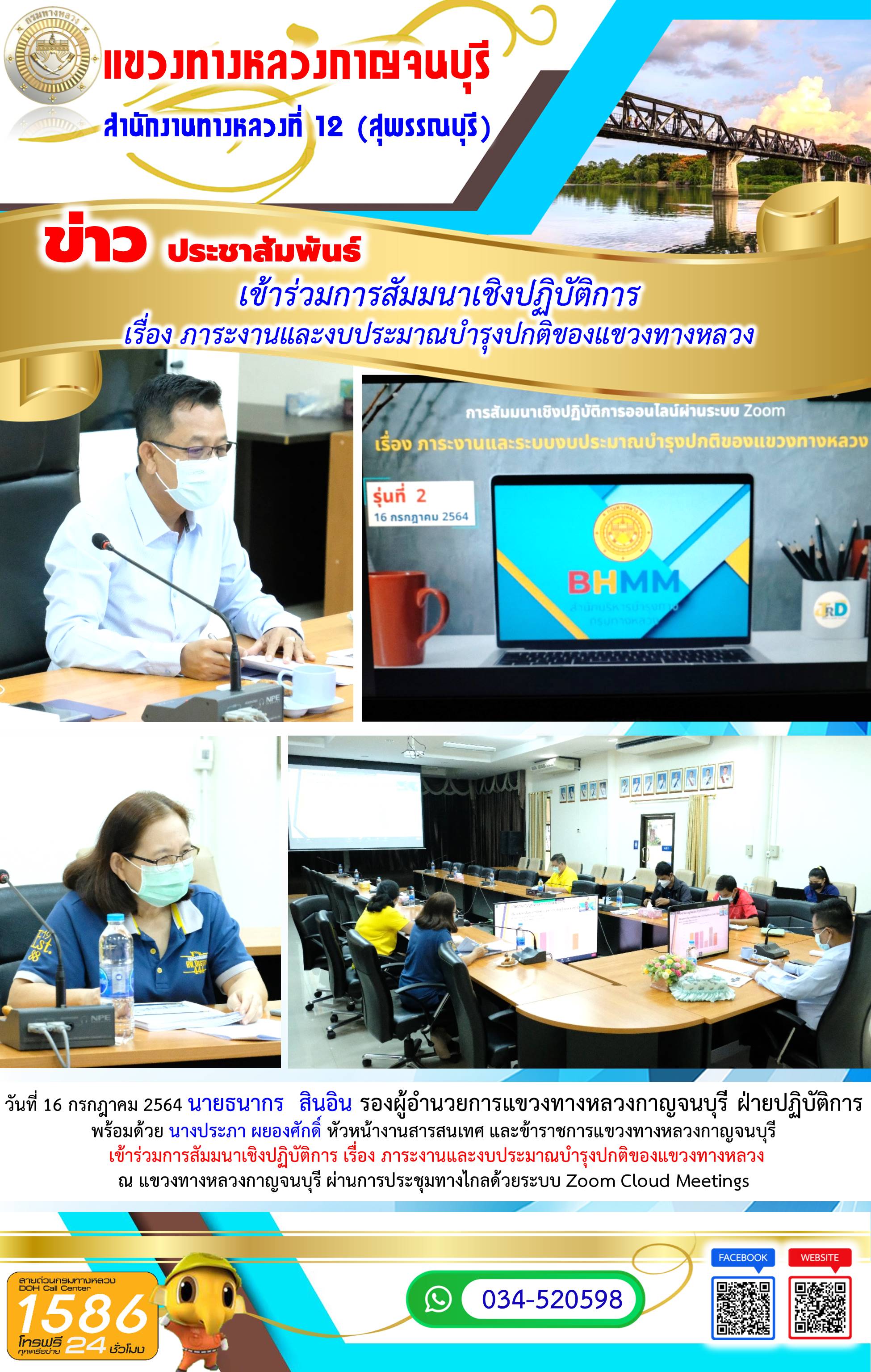 วันที่ 28 พฤษภาคม 2564 นายแสงทอง พาแก้ว ผู้อำนวยการแขวงทางหลวงกาญจนบุรี พร้อมด้วย นายสุเทพ คงประสาท รองผู้อำนวยการแขวงทางหลวงกาญจนบุรี ฝ่ายวิศวกรรม และ นายอิสระ เอมฉวี หัวหน้างานวางแผน เข้าร่วมประชุมสรุปประเด็นปัญหาในพื้นที่เขต/แขวง ทั่วประเทศ ณ แขวงทางหลวงกาญจนบุรี ผ่านการประชุมทางไกลด้วยระบบ Zoom Cloud Meetings โดยมี นายสราวุธ ทรงศิวิไล อธิบดีกรมทางหลวง เป็นประธานการประชุมทางไกล