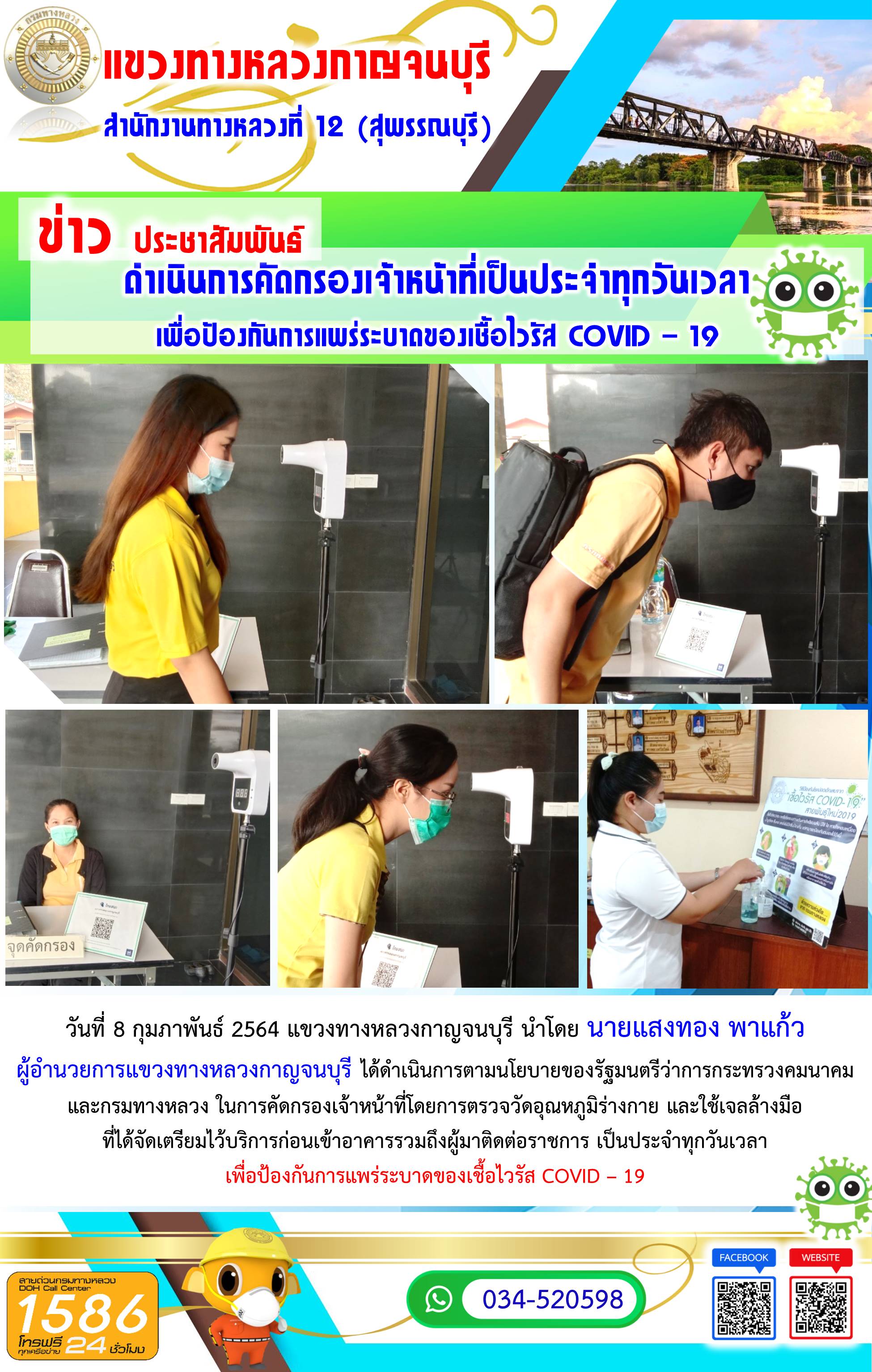วันที่ 8 กุมภาพันธ์ 2564 แขวงทางหลวงกาญจนบุรี นำโดย นายแสงทอง พาแก้ว ผู้อำนวยการแขวงทางหลวงกาญจนบุรี ได้ดำเนินการตามนโยบายของรัฐมนตรีว่าการกระทรวงคมนาคมและกรมทางหลวง ในการคัดกรองเจ้าหน้าที่โดยการตรวจวัดอุณหภูมิร่างกาย และใช้เจลล้างมือที่ได้จัดเตรียมไว้บริการก่อนเข้าอาคารรวมถึงผู้มาติดต่อราชการ เพื่อป้องกันการแพร่ระบาดของเชื้อไวรัส COVID – 19