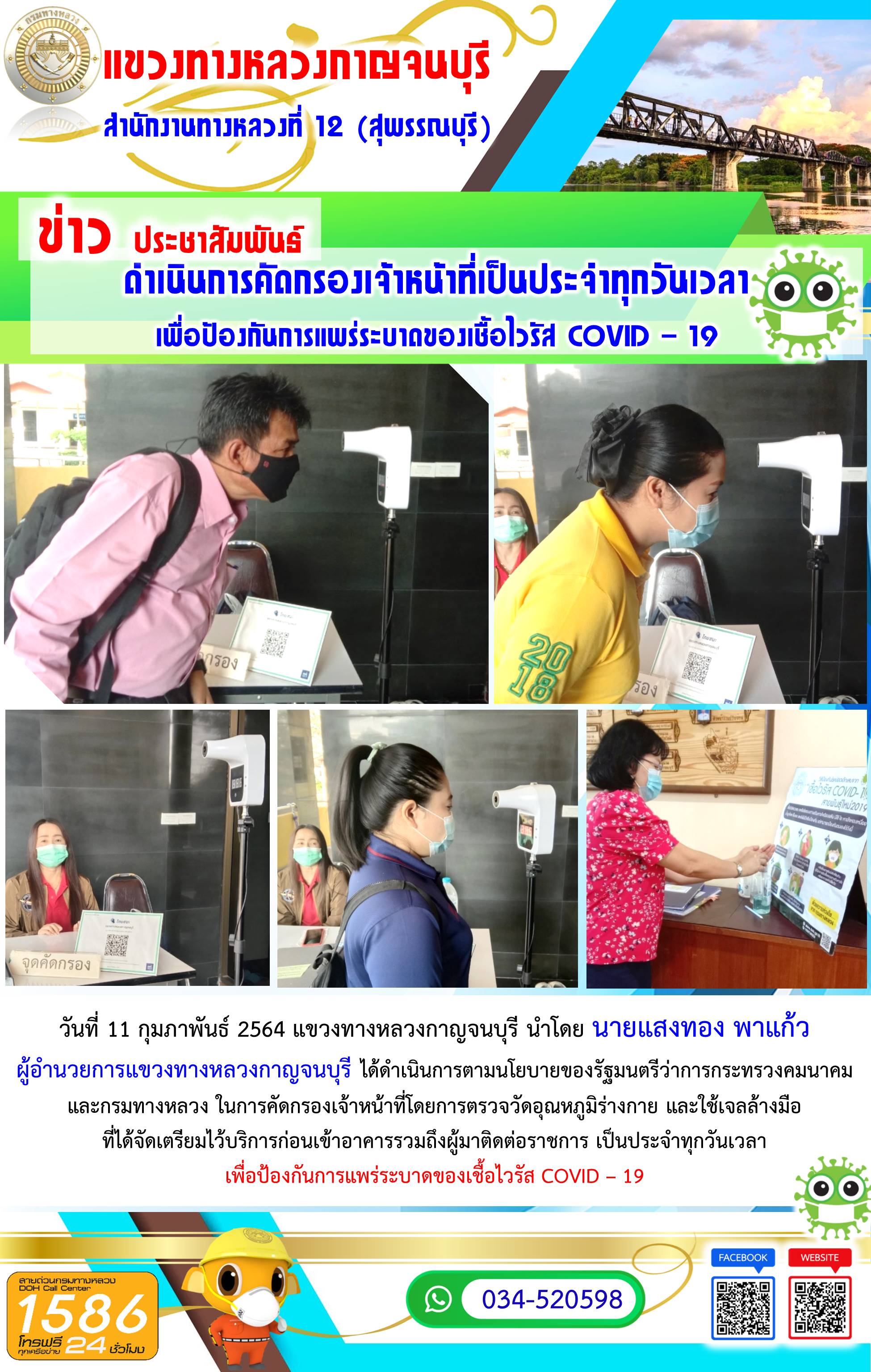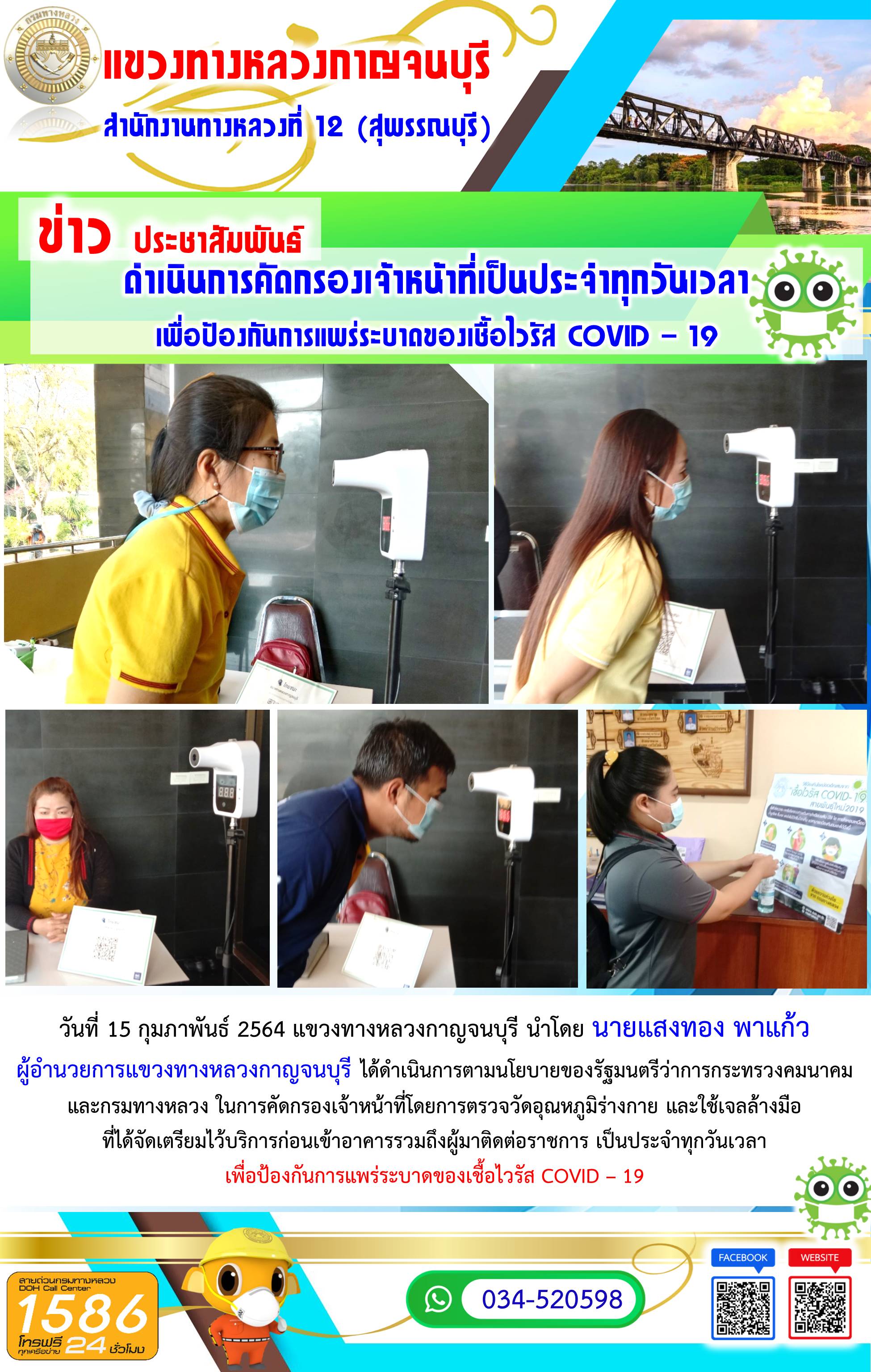 วันที่ 15 กุมภาพันธ์ 2564 แขวงทางหลวงกาญจนบุรี นำโดย นายแสงทอง พาแก้ว ผู้อำนวยการแขวงทางหลวงกาญจนบุรี ได้ดำเนินการตามนโยบายของรัฐมนตรีว่าการกระทรวงคมนาคมและกรมทางหลวง ในการคัดกรองเจ้าหน้าที่โดยการตรวจวัดอุณหภูมิร่างกาย และใช้เจลล้างมือที่ได้จัดเตรียมไว้บริการก่อนเข้าอาคารรวมถึงผู้มาติดต่อราชการ เพื่อป้องกันการแพร่ระบาดของเชื้อไวรัส COVID – 19
