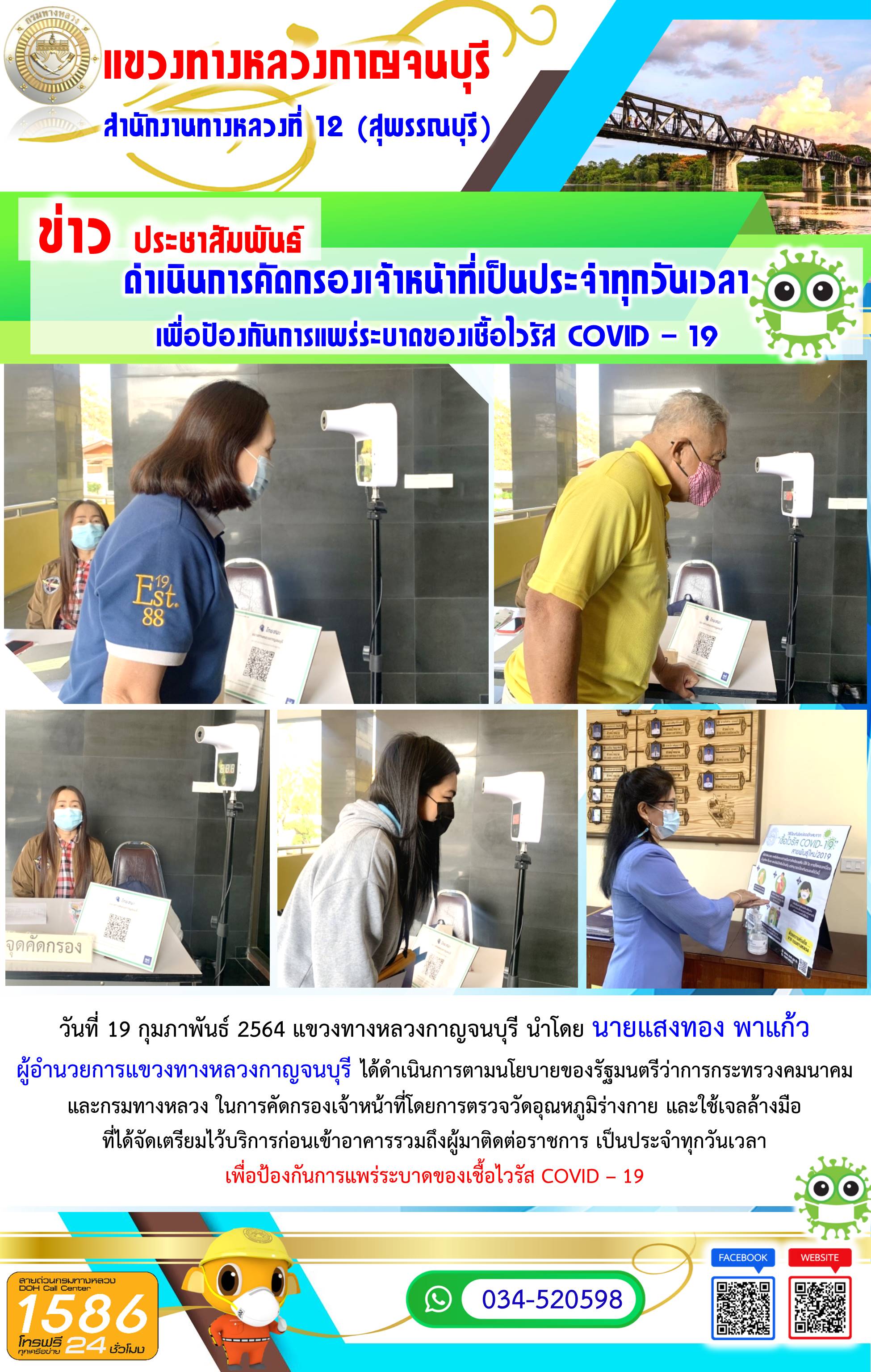 วันที่ 19 กุมภาพันธ์ 2564 แขวงทางหลวงกาญจนบุรี นำโดย นายแสงทอง พาแก้ว ผู้อำนวยการแขวงทางหลวงกาญจนบุรี ได้ดำเนินการตามนโยบายของรัฐมนตรีว่าการกระทรวงคมนาคมและกรมทางหลวง ในการคัดกรองเจ้าหน้าที่โดยการตรวจวัดอุณหภูมิร่างกาย และใช้เจลล้างมือที่ได้จัดเตรียมไว้บริการก่อนเข้าอาคารรวมถึงผู้มาติดต่อราชการ เพื่อป้องกันการแพร่ระบาดของเชื้อไวรัส COVID – 19