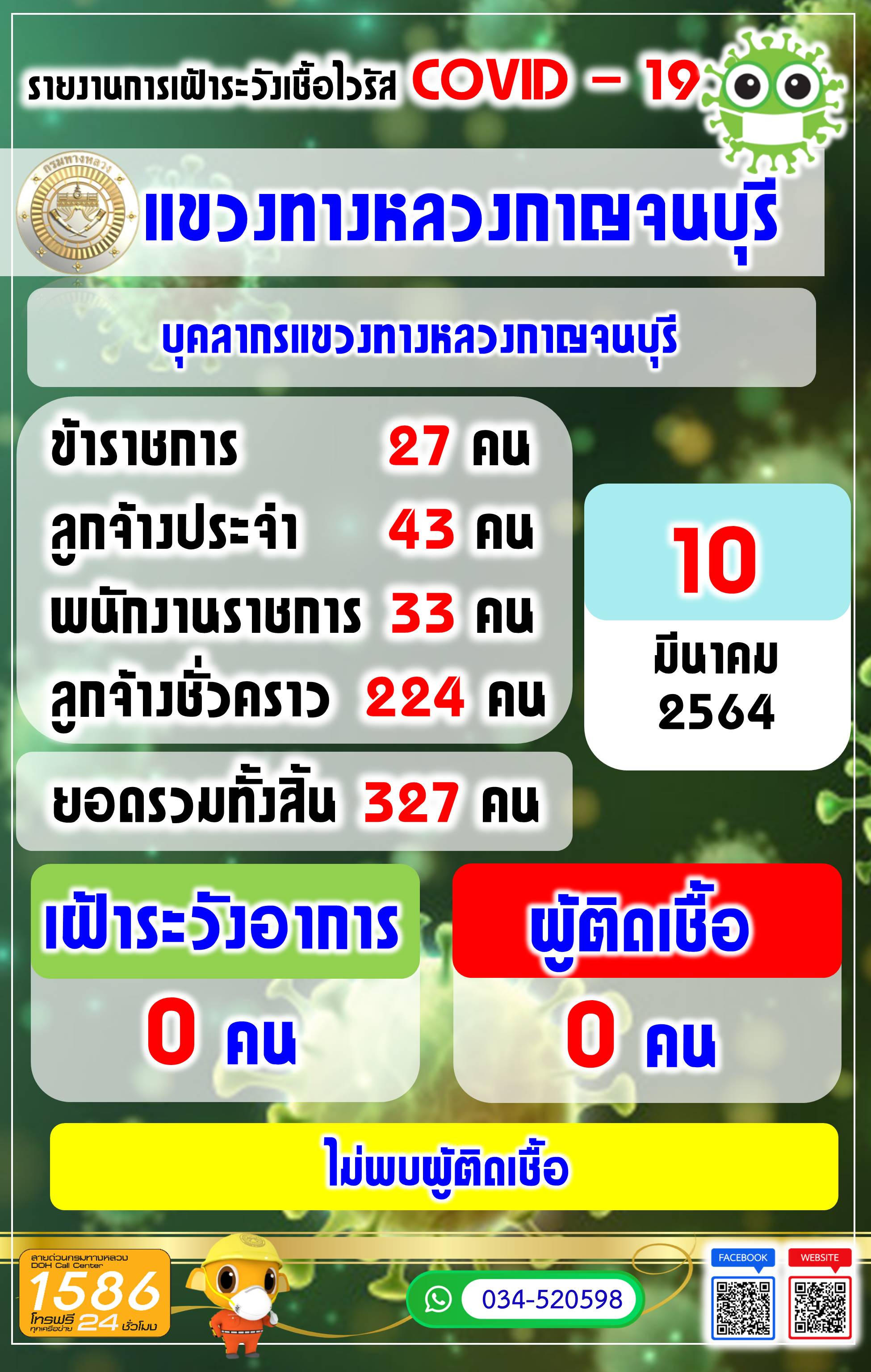 วันที่ 10 มีนาคม 2564 แขวงทางหลวงกาญจนบุรี นำโดย นายแสงทอง พาแก้ว ผู้อำนวยการแขวงทางหลวงกาญจนบุรี ได้ดำเนินการตามนโยบายของรัฐมนตรีว่าการกระทรวงคมนาคมและกรมทางหลวง ในการคัดกรองเจ้าหน้าที่โดยการตรวจวัดอุณหภูมิร่างกาย และใช้เจลล้างมือที่ได้จัดเตรียมไว้บริการก่อนเข้าอาคารรวมถึงผู้มาติดต่อราชการ เพื่อป้องกันการแพร่ระบาดของเชื้อไวรัส COVID – 19