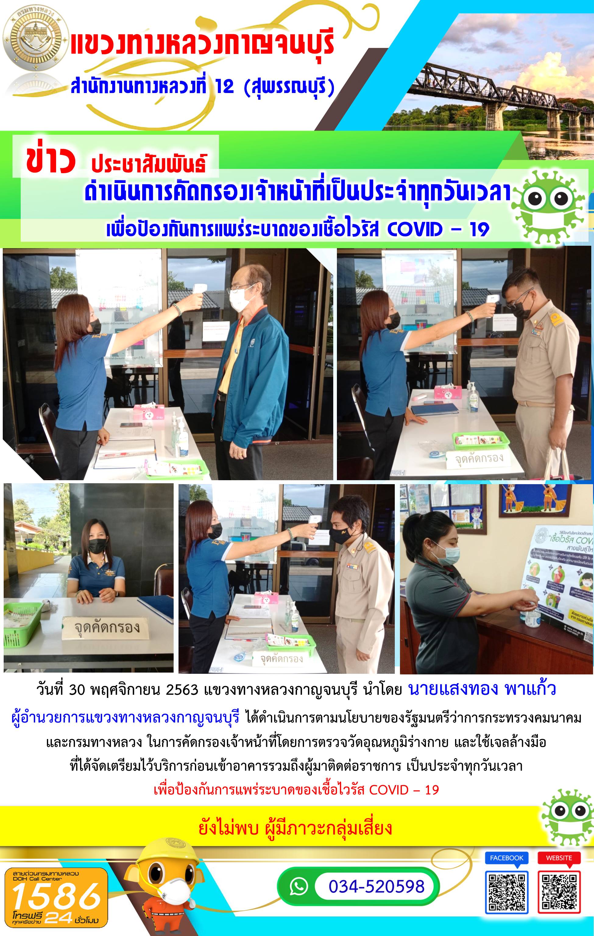 วันที่ 30 พฤศจิกายน 2563 แขวงทางหลวงกาญจนบุรี นำโดย นายแสงทอง พาแก้ว ผู้อำนวยการแขวงทางหลวงกาญจนบุรี ได้ดำเนินการตามนโยบายของรัฐมนตรีว่าการกระทรวงคมนาคมและกรมทางหลวง ในการคัดกรองเจ้าหน้าที่โดยการตรวจวัดอุณหภูมิร่างกาย และใช้เจลล้างมือที่ได้จัดเตรียมไว้บริการก่อนเข้าอาคารรวมถึงผู้มาติดต่อราชการ เพื่อป้องกันการแพร่ระบาดของเชื้อไวรัส COVID – 19