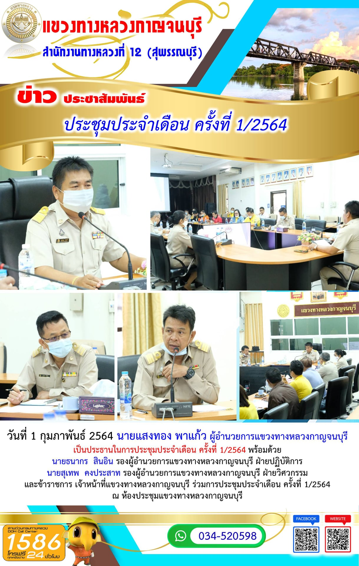 วันที่ 1 กุมภาพันธ์ 2564 นายแสงทอง พาแก้ว ผู้อำนวยการแขวงทางหลวงกาญจนบุรี เป็นประธานในการประชุมประจำเดือน ครั้งที่ 1/2564 พร้อมด้วย นายธนากร สินอิน รองผู้อำนวยการแขวงทางหลวงกาญจนบุรี ฝ่ายปฏิบัติการ นายสุเทพ คงประสาท รองผู้อำนวยการแขวงทางหลวงกาญจนบุรี ฝ่ายวิศวกรรม และข้าราชการ เจ้าหน้าที่แขวงทางหลวงกาญจนบุรี ร่วมการประชุมประจำเดือน ครั้งที่ 1/2564 ณ ห้องประชุมแขวงทางหลวงกาญจนบุรี