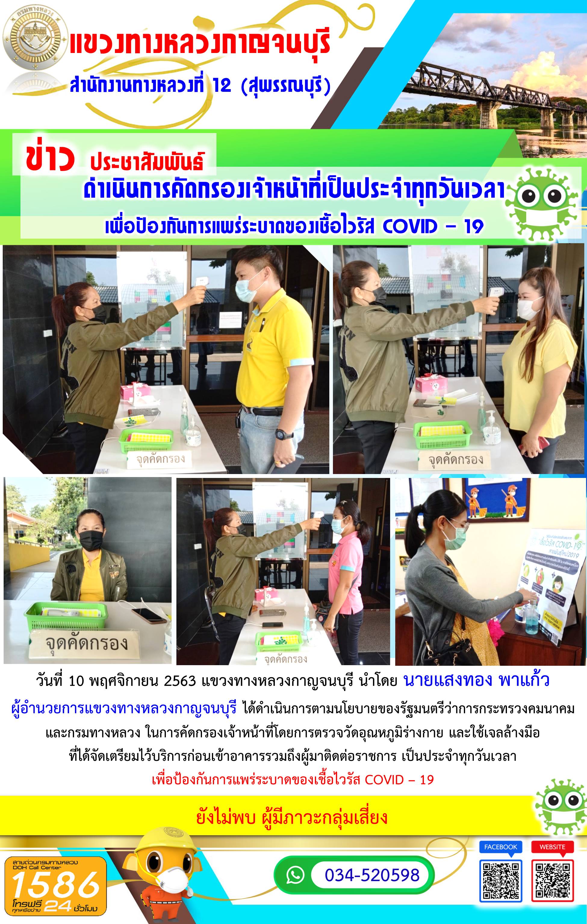 วันที่ 10 พฤศจิกายน 2563 แขวงทางหลวงกาญจนบุรี นำโดย นายแสงทอง พาแก้ว ผู้อำนวยการแขวงทางหลวงกาญจนบุรี ได้ดำเนินการตามนโยบายของรัฐมนตรีว่าการกระทรวงคมนาคมและกรมทางหลวง ในการคัดกรองเจ้าหน้าที่โดยการตรวจวัดอุณหภูมิร่างกาย และใช้เจลล้างมือที่ได้จัดเตรียมไว้บริการก่อนเข้าอาคารรวมถึงผู้มาติดต่อราชการ เพื่อป้องกันการแพร่ระบาดของเชื้อไวรัส COVID – 19