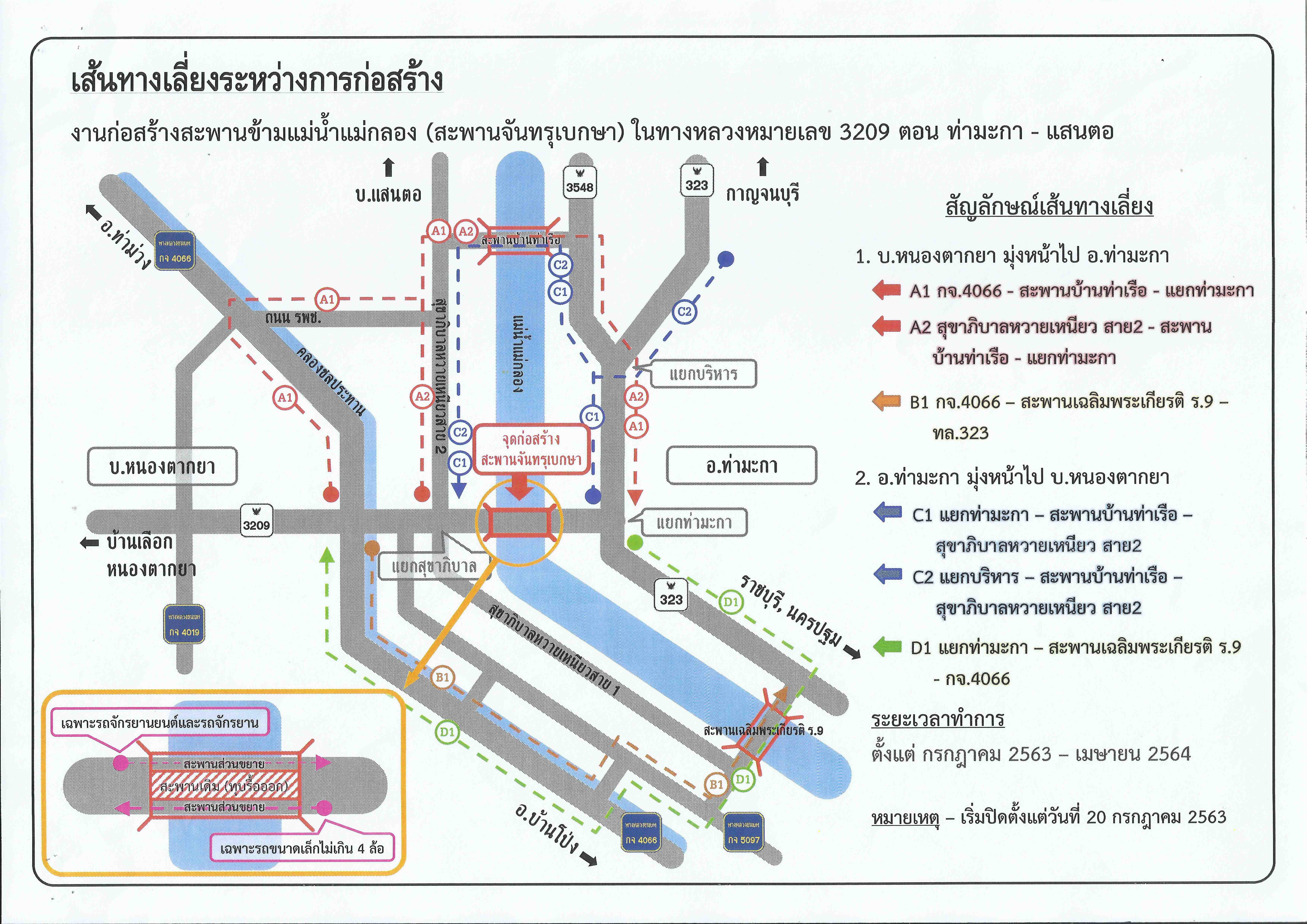 ประชาสัมพันธ์เส้นทางเลี่ยงระหว่างการก่อสร้าง งานก่อสร้างสะพานข้ามแม่น้ำแม่กลอง (สะพานจันทรุเบกษา) ในทางหลวงหมายเลข 3209 ตอน ท่ามะกา - แสนตอ