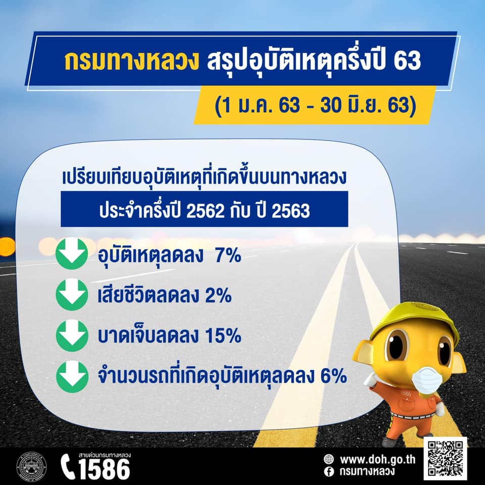 กรมทางหลวง สรุปอุบัติเหตุบนทางหลวงครึ่งปี 2563 อุบัติเหตุลดลง 7% ทางตรงเกิดเหตุสูงสุด พร้อมขอความร่วมมือผู้ใช้ทางปฏิบัติตามกฎจราจรอย่างเคร่งครัด