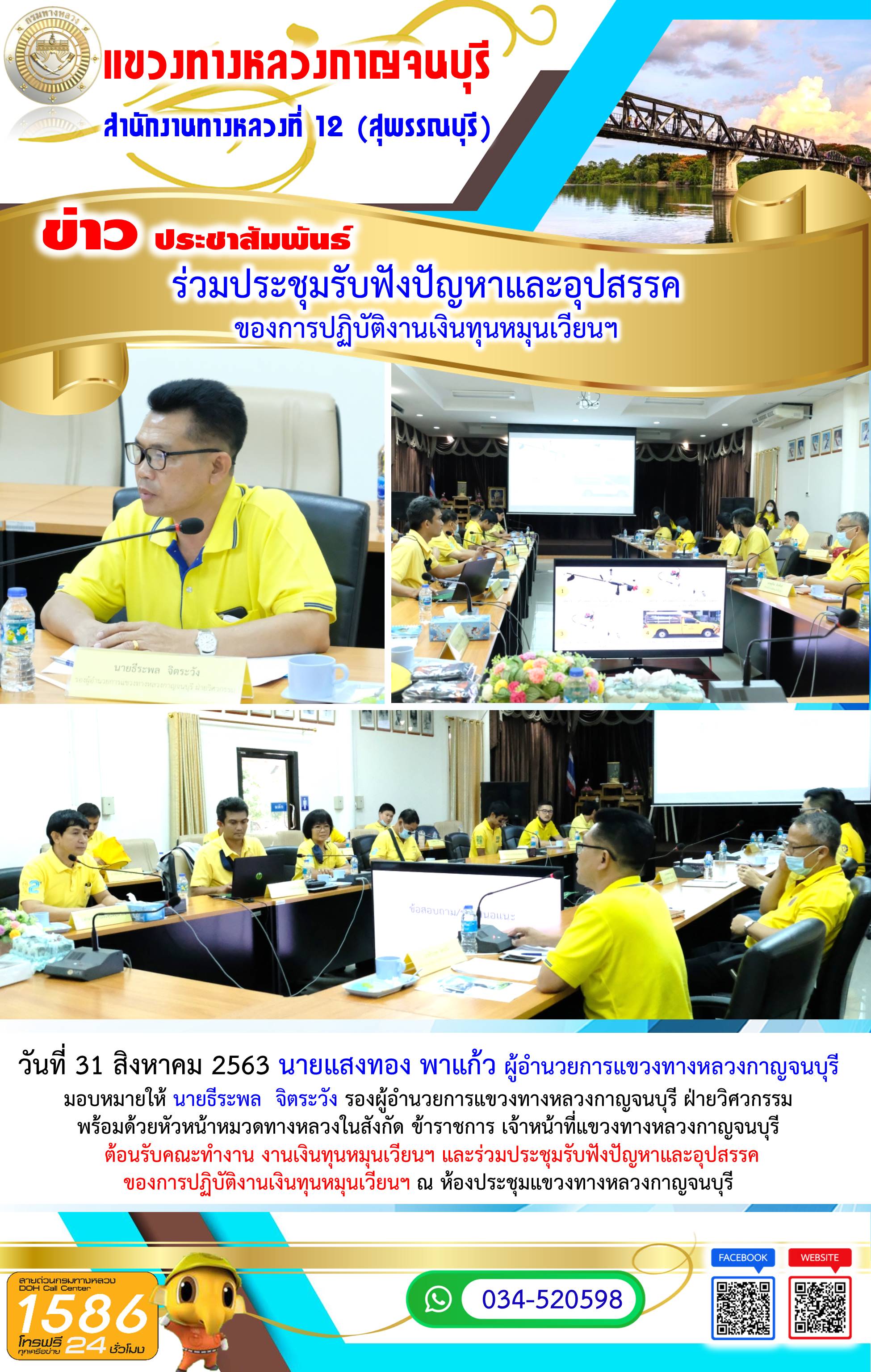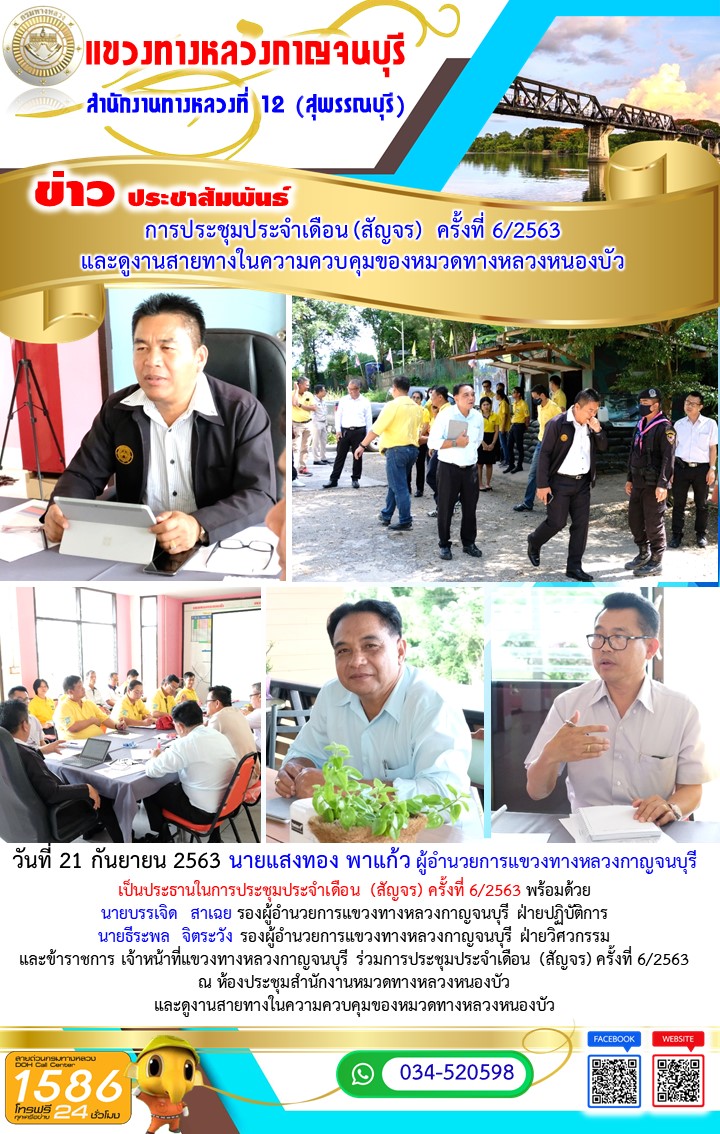 วันที่ 21 กันยายน 2563 นายแสงทอง พาแก้ว ผู้อำนวยการแขวงทางหลวงกาญจนบุรี เป็นประธานในการประชุมประจำเดือน (สัญจร) ครั้งที่ 6/2563 พร้อมด้วย นายบรรเจิด สาเฉย รองผู้อำนวยการแขวงทางหลวงกาญจนบุรี ฝ่ายปฏิบัติการ นายธีระพล จิตระวัง รองผู้อำนวยการแขวงทางหลวงกาญจนบุรี ฝ่ายวิศวกรรม และข้าราชการ เจ้าหน้าที่แขวงทางหลวงกาญจนบุรี ร่วมการประชุมประจำเดือน (สัญจร) ครั้งที่ 6/2563 ณ ห้องประชุมสำนักงานหมวดทางหลวงหนองบัว และดูงานสายทางในความควบคุมของหมวดทางหลวงหนองบัว