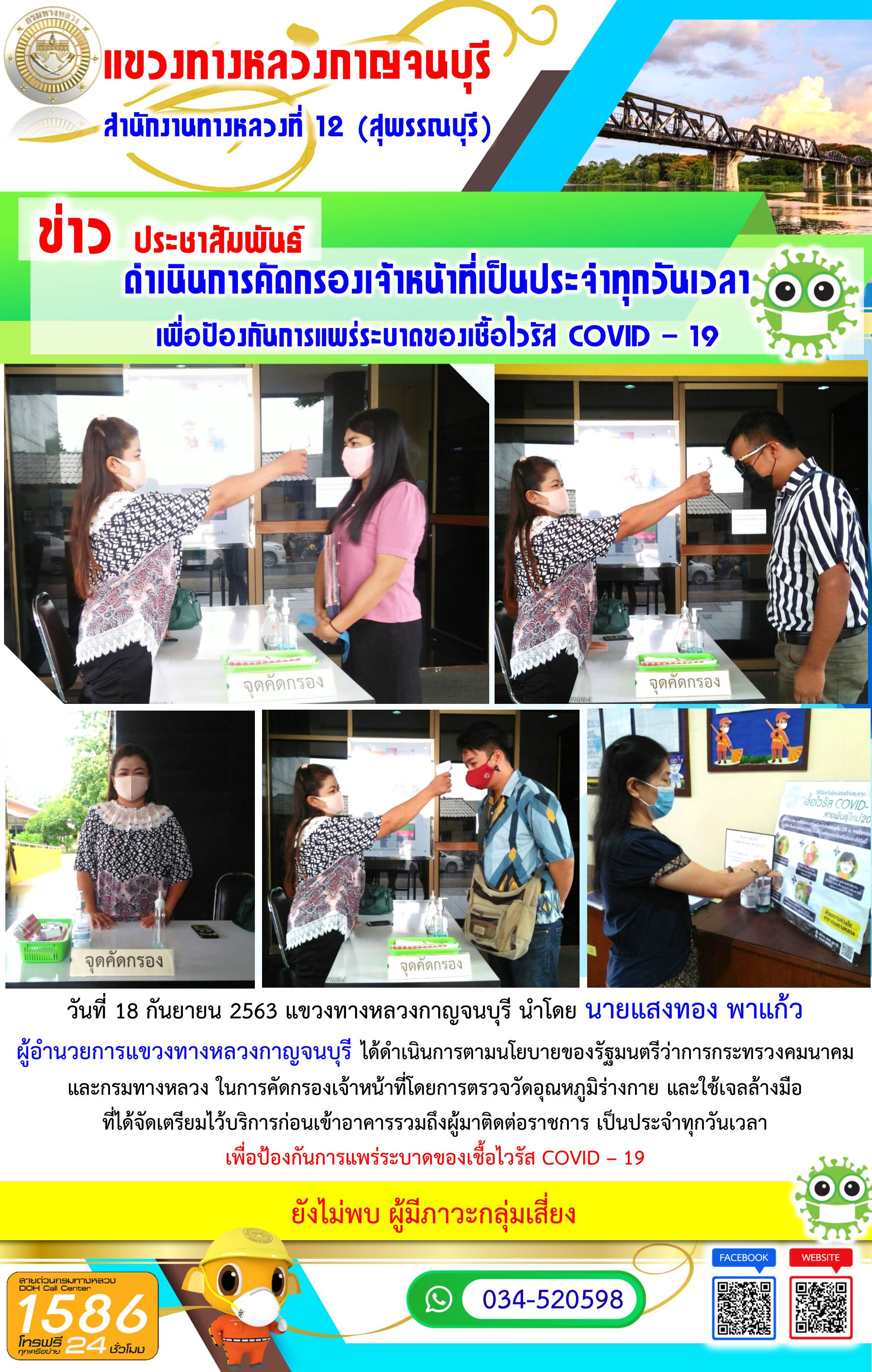 วันที่ 18 กันยายน 2563 แขวงทางหลวงกาญจนบุรี นำโดย นายแสงทอง พาแก้ว ผู้อำนวยการแขวงทางหลวงกาญจนบุรี ได้ดำเนินการตามนโยบายของรัฐมนตรีว่าการกระทรวงคมนาคมและกรมทางหลวง ในการคัดกรองเจ้าหน้าที่โดยการตรวจวัดอุณหภูมิร่างกาย และใช้เจลล้างมือที่ได้จัดเตรียมไว้บริการก่อนเข้าอาคารรวมถึงผู้มาติดต่อราชการ เพื่อป้องกันการแพร่ระบาดของเชื้อไวรัส COVID – 19