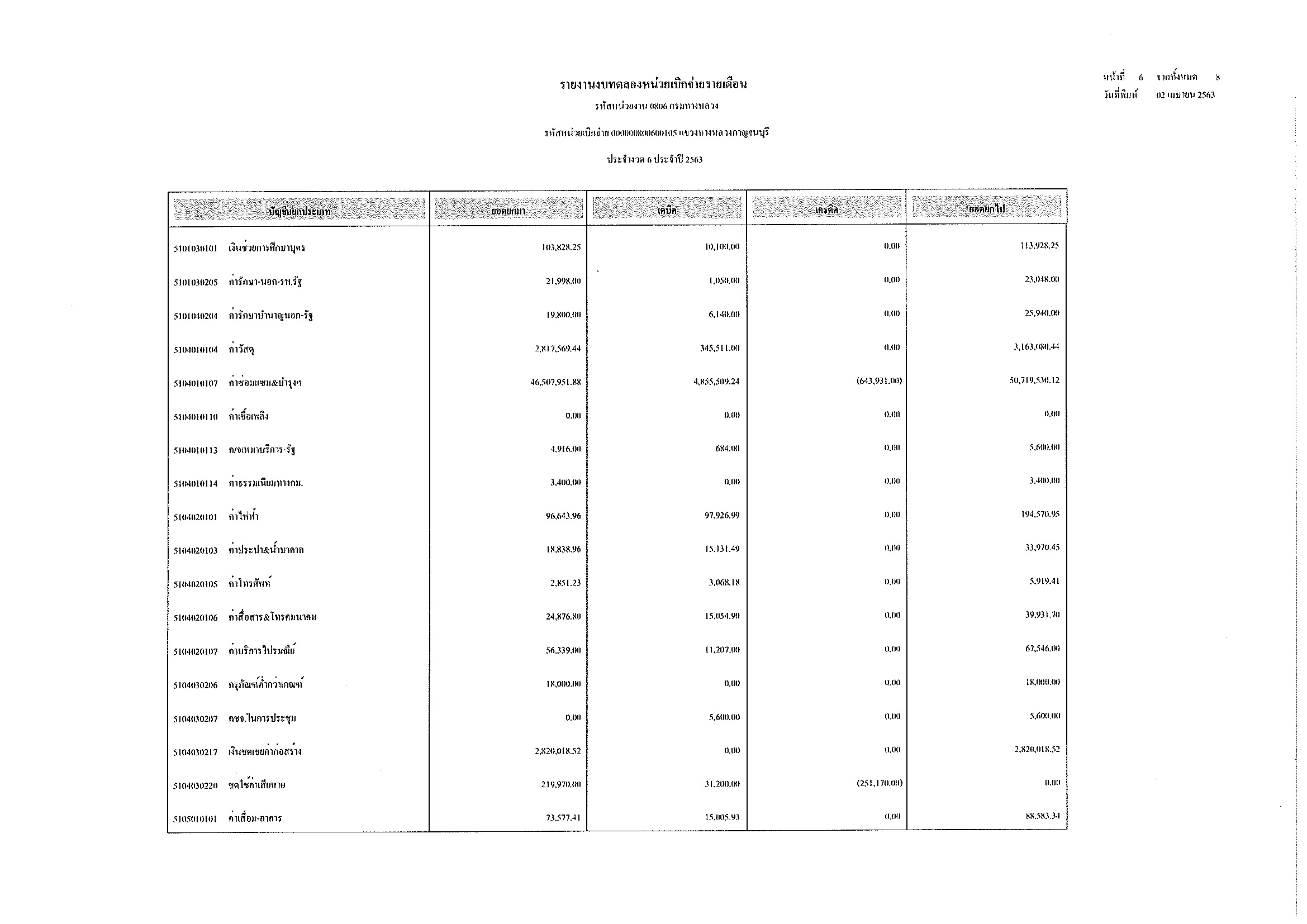 รายงานงบทดลองหน่วยเบิกจ่ายรายเดือน ประจำงวด 6 ประจำปีที่ 2563