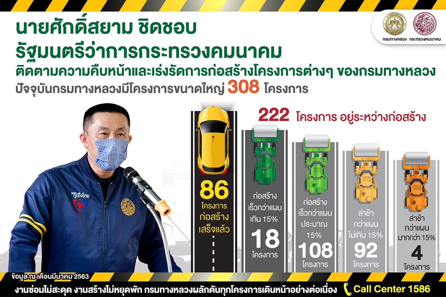นายศักดิ์สยาม ชิดชอบ รัฐมนตรีว่าการกระทรวงคมนาคม ติดตามความคืบหน้า และเร่งรัดการก่อสร้างโครงการต่างๆของกรมทางหลวงปัจจุบันกรมทางหลวงมีโครงการขนาดใหญ่ 308 โครงการ