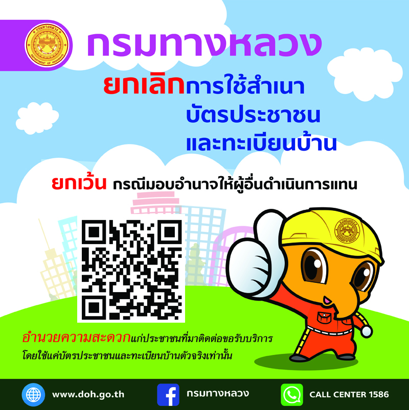 กรมทางหลวง อำนวยความสะดวกให้แก่ประชาชนที่มาติดต่อขอรับบริการ จากหน่วยงานของกรมทางหลวง ใช้แค่บัตรประชาชนและทะเบียนบ้านตัวจริง โดยจะไม่เรียกสำเนาเอกสารที่ทางราชการออกให้จากประชาชน แต่ยกเว้นกรณีมอบอำนาจให้ผู้อื่นดำเนินการแทน
