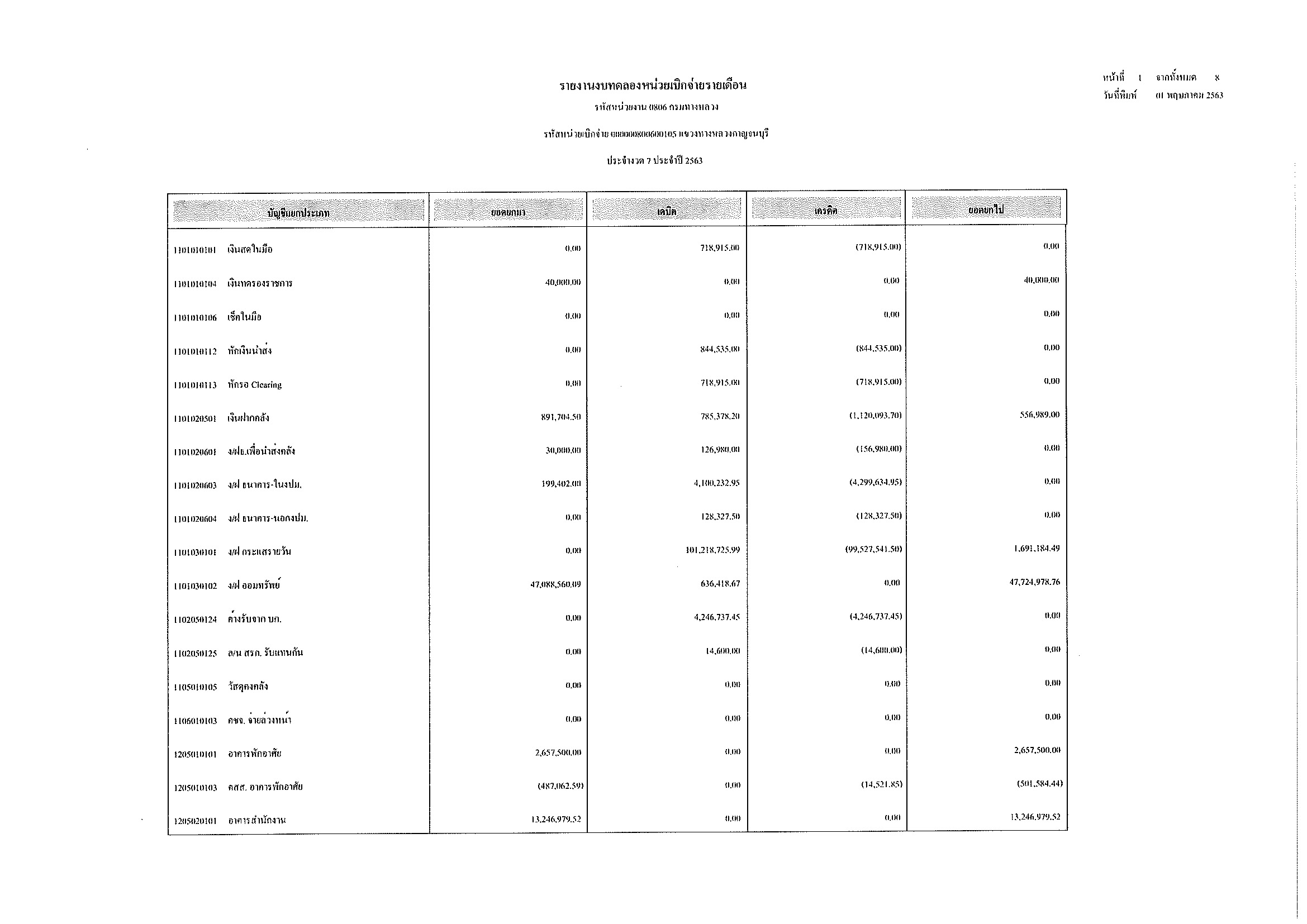 รายงานงบทดลองหน่วยเบิกจ่ายรายเดือน ประจำงวด 7 ประจำปีที่ 2563
