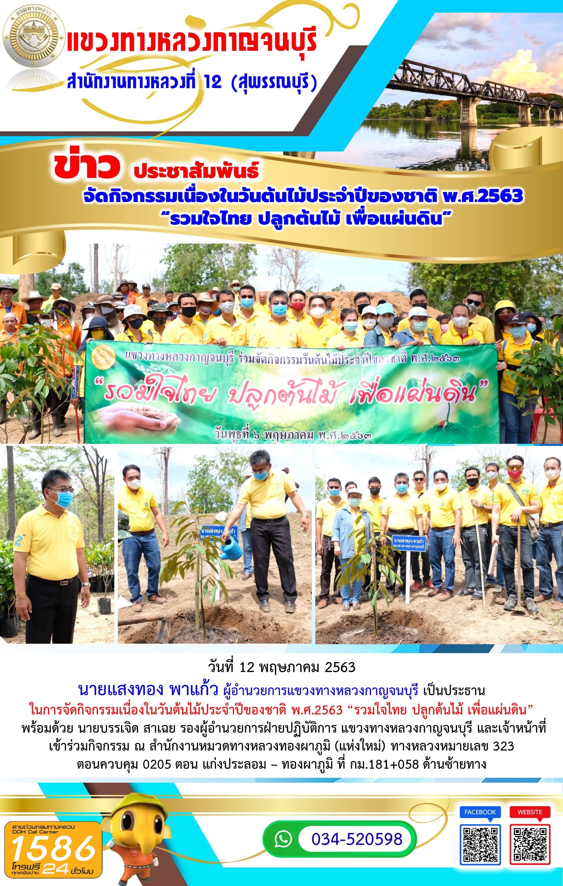วันที่ 28 เมษายน 2563 แขวงทางหลวงกาญจนบุรี นำโดย นายแสงทอง พาแก้ว ผู้อำนวยการแขวงทางหลวงกาญจนบุรี ได้ดำเนินการตามนโยบายของรัฐมนตรีว่าการกระทรวงคมนาคมและกรมทางหลวง ในการคัดกรองเจ้าหน้าที่โดยการตรวจวัดอุณหภูมิร่างกาย และใช้เจลล้างมือที่ได้จัดเตรียมไว้บริการก่อนเข้าอาคารรวมถึงผู้มาติดต่อราชการ เพื่อป้องกันการแพร่ระบาดของเชื้อไวรัส COVID – 19