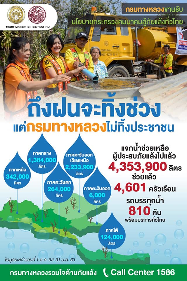 คมนาคมกำชับกรมทางหลวงแจกน้ำบรรเทาทุกข์ภัยแล้งอย่างต่อเนื่องกรมทางหลวงเดินหน้าคลายความเดือดร้อนชาวบ้าน และหน่วยงานต่าง ๆ ช่วงภัยแล้งระดมรถบรรทุกน้ำ 810 คัน แจกน้ำดื่มน้ำใช้กว่า 4 ล้านลิตร 4,601 ครัวเรือนทั่วประเทศ ช่วยดับไฟป่า 225 ครั้ง แนะขาดน้ำโทรสายด่วนกรมทางหลวง 1586 ตลอด 24 ชั่วโมง ออกนโยบายหน่วยงานสังกัดจ้างเกษตรกร ทำงานในโครงการที่มีอยู่ชดเชยรายได้สูญ พร้อมแผนช่วยรายได้ชาวสวนยางสั่งเพิ่มปริมาณใช้น้ำยางดิบปีนี้ 26,564 ตัน