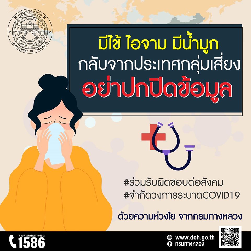 มีไข้ ไอจาม มีน้ำมูก กลับจากประเทศกลุ่มเสี่ยง อย่าปกปิดข้อมูล ด้วยความห่วงใยจากกรมทางหลวง