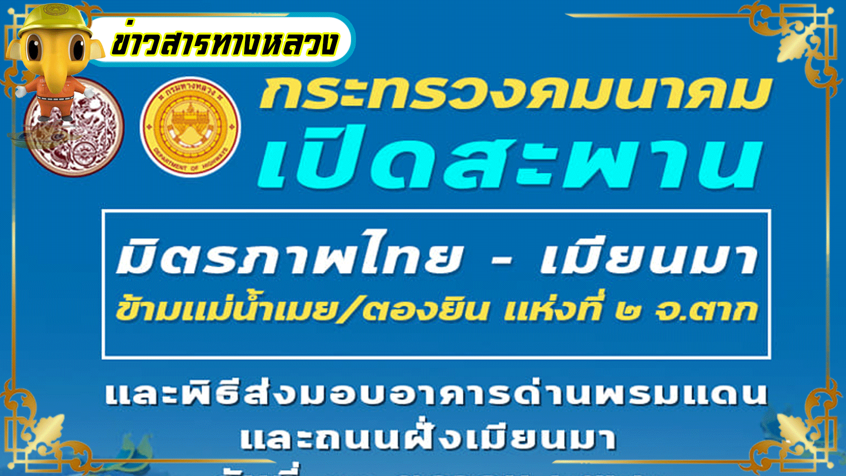 กระทรวงคมนาคม เปิดสะพาน มิตรภาพไทย - เมียนมา ข้ามแม่น้ำเมย/ตองยิน แห่งที่ 2 จังหวัด ตาก โดยกำหนดเปิดใช้สะพานอย่างเป็นทางการในวันที่ 30 ต.ค. 2562